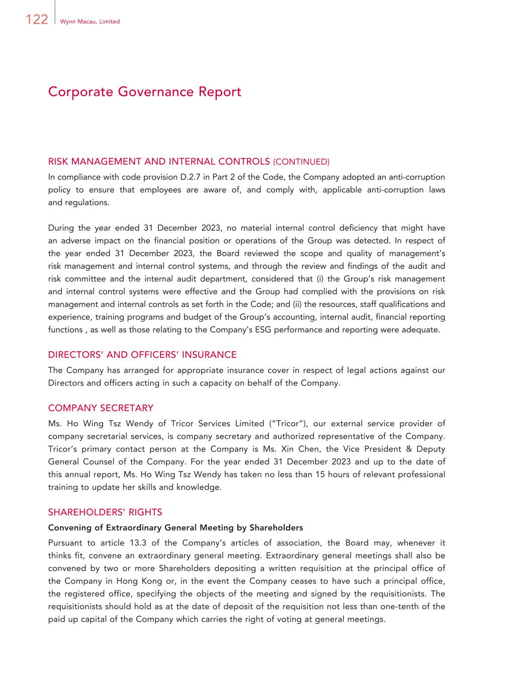 43Annual Report 2023 Management Discussion and Analysis Any violation of applicable anti-money laundering laws and regulations, the Foreign Corrupt Practices Act (“FCPA”) and other anti-corruption laws, or resulting sanctions and penalties could adversely affect our business, performance, prospects, value, financial condition, and results of operations. We deal with significant amounts of cash in our operations and are subject to various jurisdictions’ reporting and anti-money laundering laws and regulations. Macau governmental authorities focus heavily on the gaming industry and compliance with anti-money laundering laws and regulations. From time to time, the Company may receive governmental and regulatory inquiries about compliance with such laws and regulations. The Company will cooperate with all such inquiries. Any violation of anti-money laundering laws or regulations could adversely affect our business, performance, prospects, value, financial condition, and results of operations. Further, as a subsidiary of WRL, we are subject to regulations imposed by the FCPA and other anti-corruption laws that generally prohibit U.S. companies and their intermediaries from offering, promising, authorizing or making improper payments to foreign government officials for the purpose of obtaining or retaining business. Violations of the FCPA and other anti-corruption laws may result in severe criminal and civil sanctions as well as other penalties, and the SEC and U.S. Department of Justice have increased their enforcement activities with respect to such laws and regulations. The Office of Foreign Assets Control and the U.S. Department of Commerce administer and enforce economic and trade sanctions based on U.S. foreign policy and national security goals against targeted foreign states, organizations, and individuals. Failure to comply with these laws and regulations could increase our cost of operations, reduce our profits, or otherwise adversely affect our business, financial condition, and results of operations. Internal control policies and procedures and employee training and compliance programs that we have implemented to deter prohibited practices may not be effective in prohibiting our and our affiliates’ directors, employees, contractors or agents from violating or circumventing our policies and the law. If we or our affiliates, or either of our respective directors, employees or agents fail to comply with applicable laws or Company policies governing our operations, the Company may face investigations, prosecutions and other legal proceedings and actions, which could result in civil penalties, administrative remedies and criminal sanctions. Any such government investigations, prosecutions or other legal proceedings or actions could adversely affect our business, performance, prospects, value, financial condition, and results of operations.