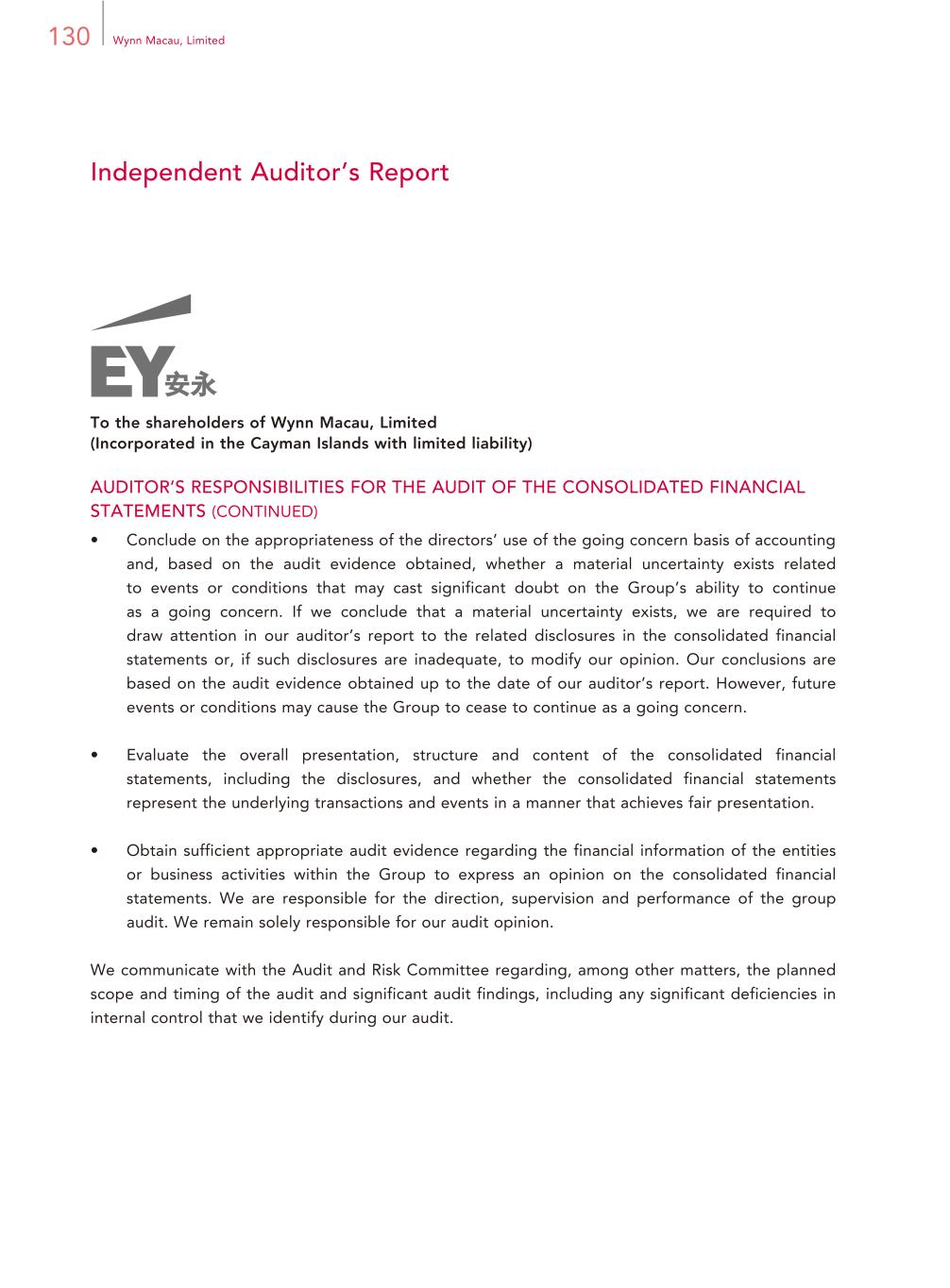 164 Wynn Macau, Limited Financial Statements Notes to Financial Statements For the year ended 31 December 2023 2.5 SIGNIFICANT ACCOUNTING JUDGMENTS AND ESTIMATES The preparation of the Group’s consolidated financial statements requires management to make judgments, estimates and assumptions that affect the reported amounts of revenues, expenses, assets and liabilities, and their accompanying disclosures and the disclosure of contingent liabilities. Uncertainty about these assumptions and estimates may result in outcomes that may require a material adjustment to the carrying amount of the asset or liability affected in the future. Key sources of estimation uncertainty and critical judgments in applying the Group’s accounting policies, which have a significant effect on the consolidated financial statements are set out below. Useful lives of property and equipment The useful lives of assets are based on management’s estimations. Management considers the impact of changes in technology, customer service requirements, availability of capital funding and the required return on assets and equity to determine the optimum useful life expectation for each of the individual categories of property and equipment. The estimations of residual values of assets are also based on management’s judgments as to whether the assets will be sold or used to the end of their useful lives and what their condition will be like at that time. Depreciation is calculated on the straight-line basis to write off the cost of each item of property and equipment to its residual value over its estimated useful life. Management’s periodic reviews on the estimations made could result in changes in depreciable lives and, therefore, depreciation expense in future periods. Impairment of non-financial assets Management is required to make judgments concerning the cause, timing and amount of impairments. In the identification of impairment indicators, management considers the impact of changes in current competitive conditions, cost of capital, availability of funding, technological obsolescence, discontinuance of services and other circumstances that could indicate that an impairment exists. The Group applies the impairment assessments to its separate CGUs. This requires management to make significant judgments concerning the existence of impairment indicators, identification of separate CGUs’ remaining useful lives of assets and estimates of projected cash flows and fair values less costs of disposal. For non-financial assets other than goodwill, management’s judgments are also required when assessing whether a previously recognized impairment loss should be reversed. Where impairment indicators exist, the determination of the recoverable amount of a CGU requires management to make assumptions to determine the fair value less costs of disposal and value-in-use. In addition, for goodwill, the recoverable amount is estimated annually whether or not there is any indication of impairment.