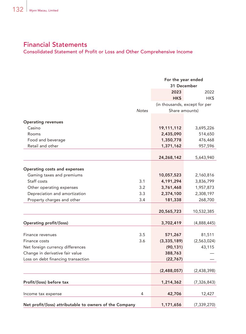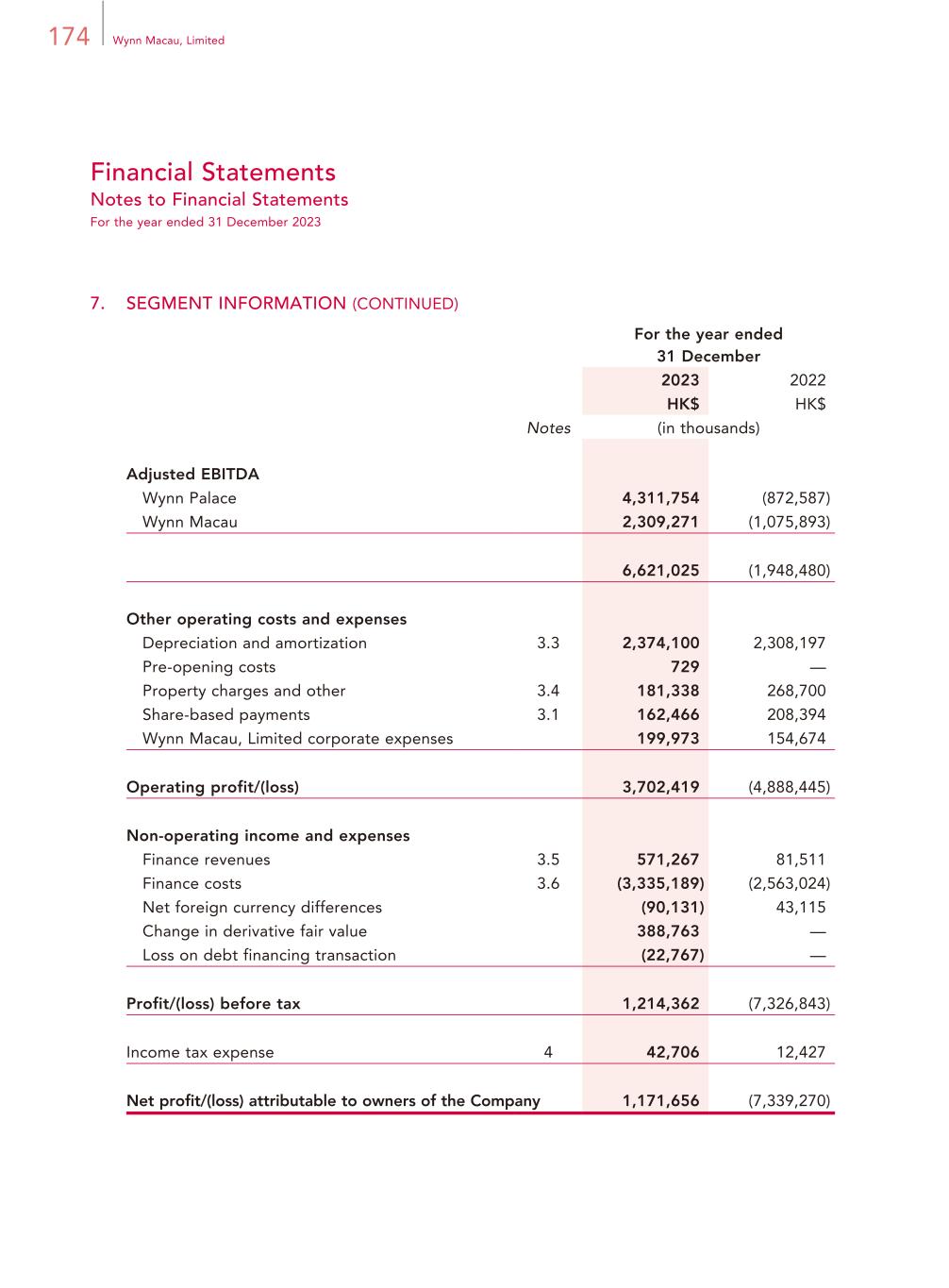 174 Wynn Macau, Limited Financial Statements Notes to Financial Statements For the year ended 31 December 2023 7. SEGMENT INFORMATION (CONTINUED) For the year ended 31 December 2023 2022 HK$ HK$ Notes (in thousands) Adjusted EBITDA Wynn Palace 4,311,754 (872,587) Wynn Macau 2,309,271 (1,075,893) 6,621,025 (1,948,480) Other operating costs and expenses Depreciation and amortization 3.3 2,374,100 2,308,197 Pre-opening costs 729 — Property charges and other 3.4 181,338 268,700 Share-based payments 3.1 162,466 208,394 Wynn Macau, Limited corporate expenses 199,973 154,674 Operating profit/(loss) 3,702,419 (4,888,445) Non-operating income and expenses Finance revenues 3.5 571,267 81,511 Finance costs 3.6 (3,335,189) (2,563,024) Net foreign currency differences (90,131) 43,115 Change in derivative fair value 388,763 — Loss on debt financing transaction (22,767) — Profit/(loss) before tax 1,214,362 (7,326,843) Income tax expense 4 42,706 12,427 Net profit/(loss) attributable to owners of the Company 1,171,656 (7,339,270)