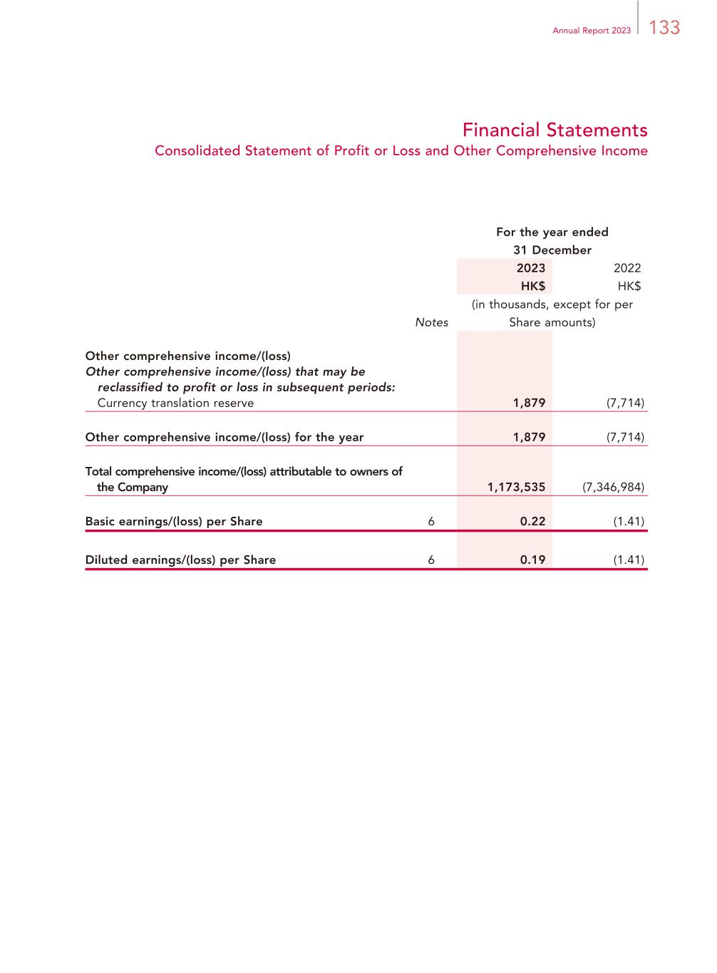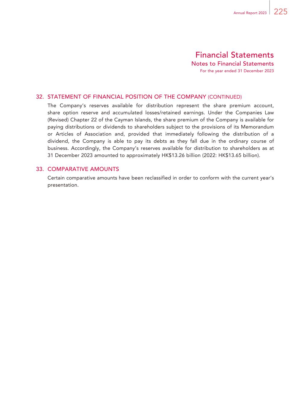 225Annual Report 2023 Financial Statements Notes to Financial Statements For the year ended 31 December 2023 32. STATEMENT OF FINANCIAL POSITION OF THE COMPANY (CONTINUED) The Company’s reserves available for distribution represent the share premium account, share option reserve and accumulated losses/retained earnings. Under the Companies Law (Revised) Chapter 22 of the Cayman Islands, the share premium of the Company is available for paying distributions or dividends to shareholders subject to the provisions of its Memorandum or Articles of Association and, provided that immediately following the distribution of a dividend, the Company is able to pay its debts as they fall due in the ordinary course of business. Accordingly, the Company’s reserves available for distribution to shareholders as at 31 December 2023 amounted to approximately HK$13.26 billion (2022: HK$13.65 billion). 33. COMPARATIVE AMOUNTS Certain comparative amounts have been reclassified in order to conform with the current year’s presentation.