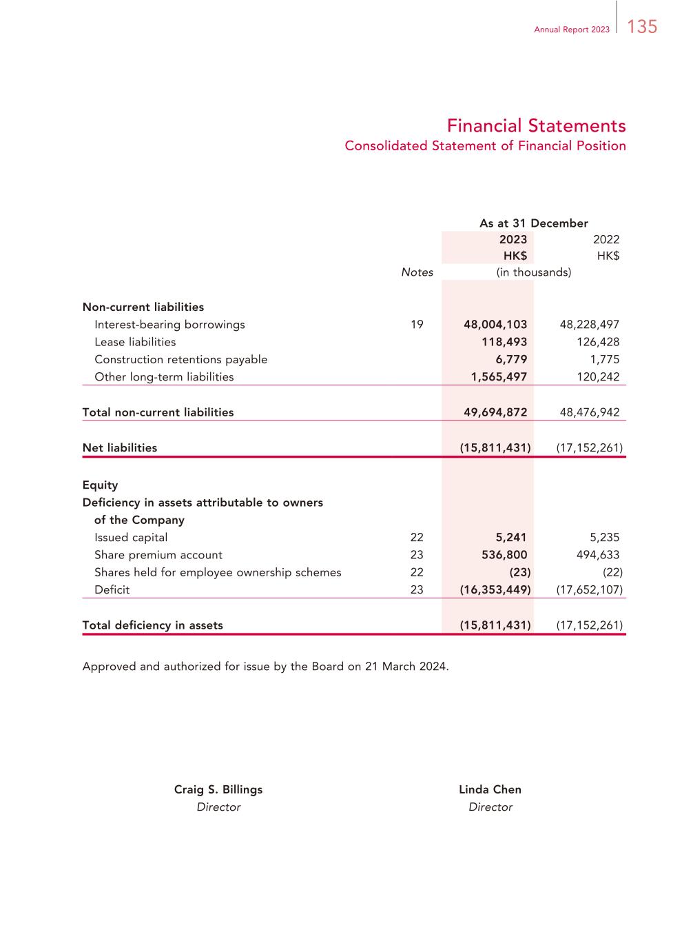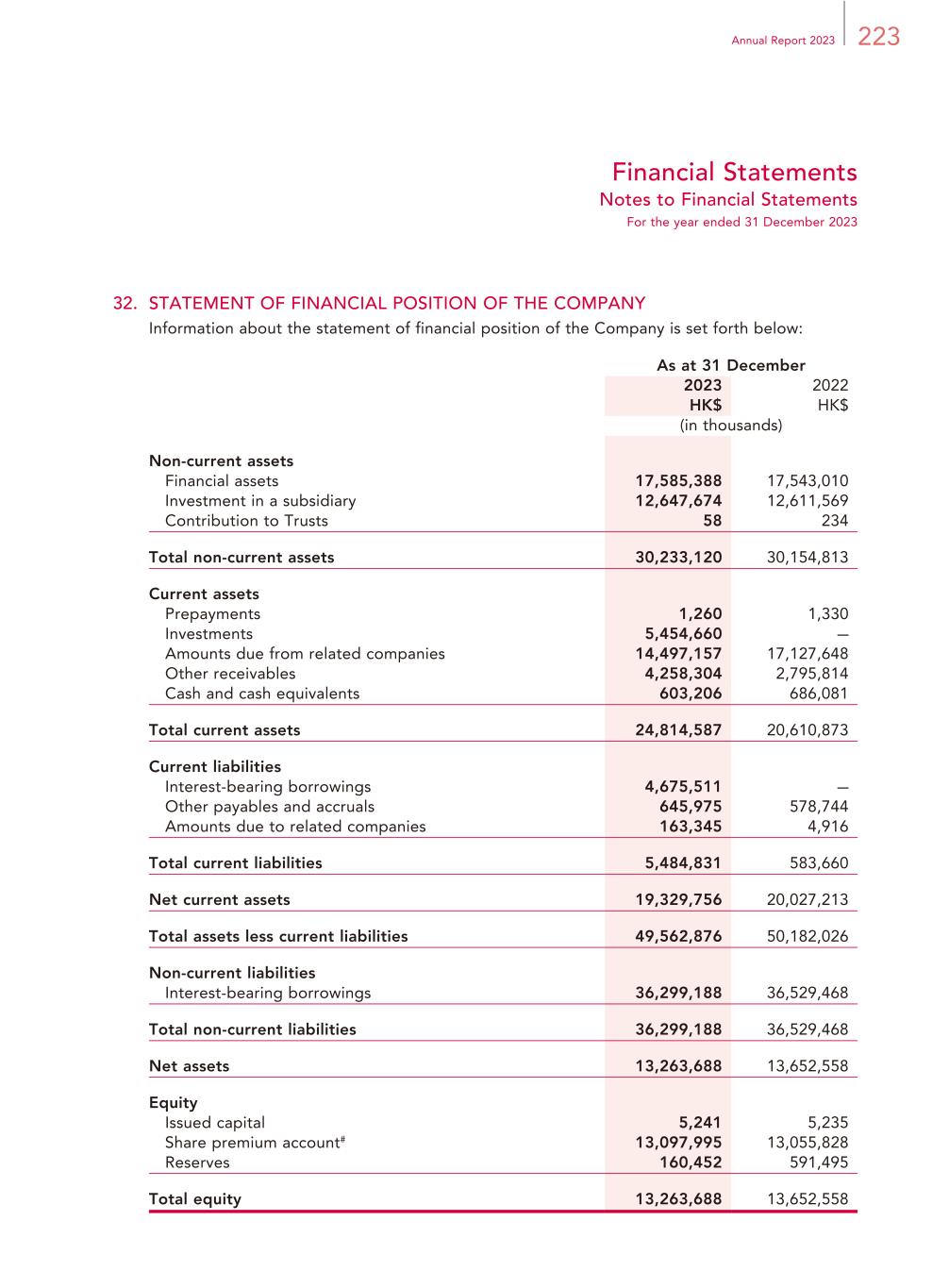 223Annual Report 2023 Financial Statements Notes to Financial Statements For the year ended 31 December 2023 32. STATEMENT OF FINANCIAL POSITION OF THE COMPANY Information about the statement of financial position of the Company is set forth below: As at 31 December 2023 2022 HK$ HK$ (in thousands) Non-current assets Financial assets 17,585,388 17,543,010 Investment in a subsidiary 12,647,674 12,611,569 Contribution to Trusts 58 234 Total non-current assets 30,233,120 30,154,813 Current assets Prepayments 1,260 1,330 Investments 5,454,660 — Amounts due from related companies 14,497,157 17,127,648 Other receivables 4,258,304 2,795,814 Cash and cash equivalents 603,206 686,081 Total current assets 24,814,587 20,610,873 Current liabilities Interest-bearing borrowings 4,675,511 — Other payables and accruals 645,975 578,744 Amounts due to related companies 163,345 4,916 Total current liabilities 5,484,831 583,660 Net current assets 19,329,756 20,027,213 Total assets less current liabilities 49,562,876 50,182,026 Non-current liabilities Interest-bearing borrowings 36,299,188 36,529,468 Total non-current liabilities 36,299,188 36,529,468 Net assets 13,263,688 13,652,558 Equity Issued capital 5,241 5,235 Share premium account# 13,097,995 13,055,828 Reserves 160,452 591,495 Total equity 13,263,688 13,652,558