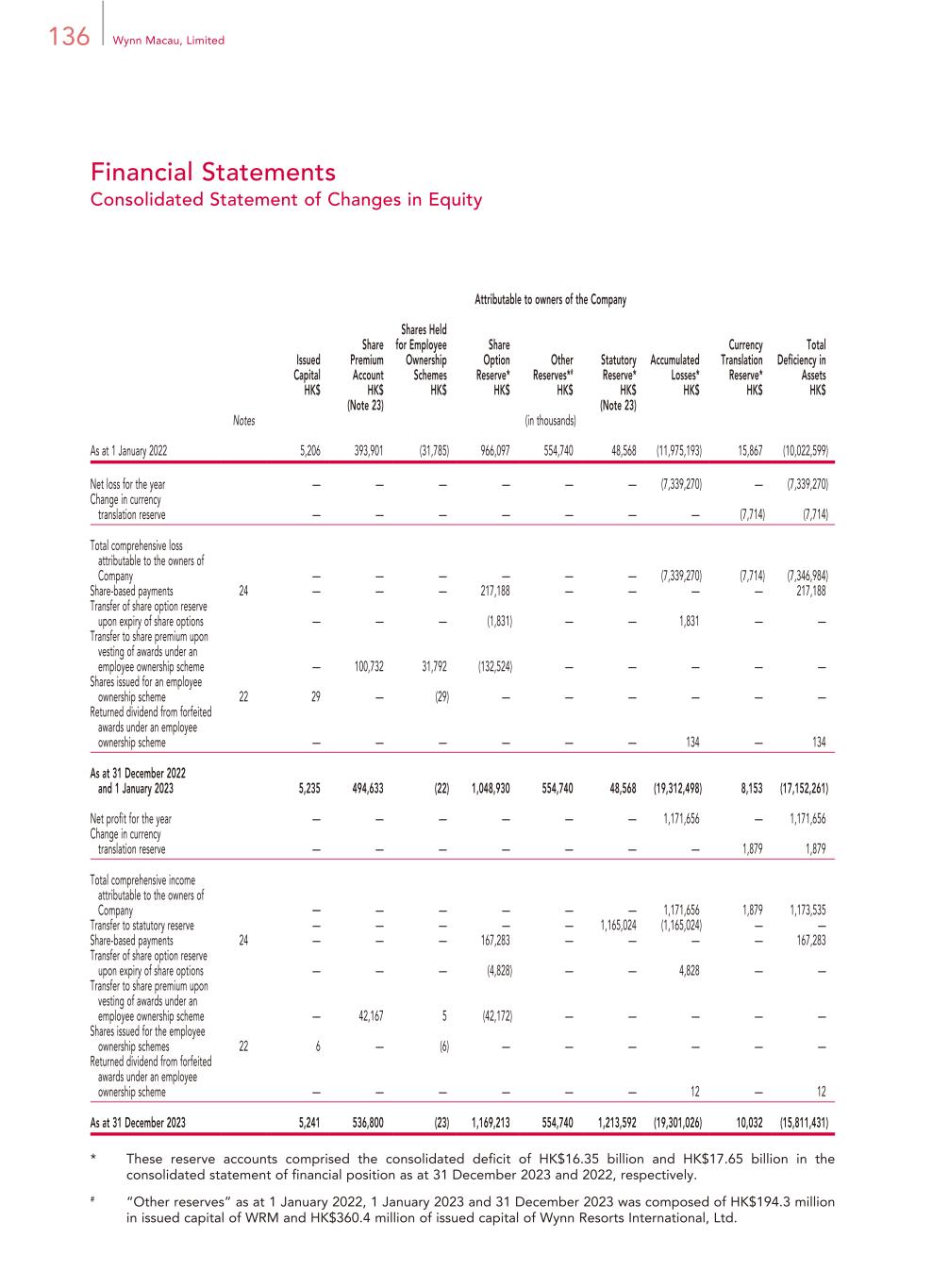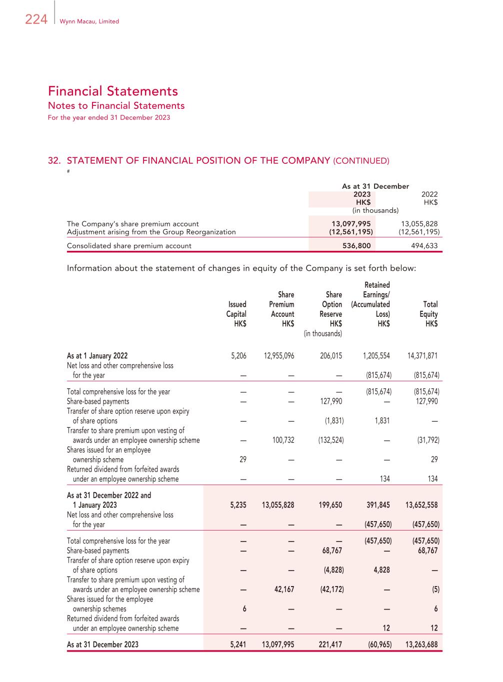224 Wynn Macau, Limited Financial Statements Notes to Financial Statements For the year ended 31 December 2023 32. STATEMENT OF FINANCIAL POSITION OF THE COMPANY (CONTINUED) # As at 31 December 2023 2022 HK$ HK$ (in thousands) The Company’s share premium account 13,097,995 13,055,828 Adjustment arising from the Group Reorganization (12,561,195) (12,561,195) Consolidated share premium account 536,800 494,633 Information about the statement of changes in equity of the Company is set forth below: Issued Capital Share Premium Account Share Option Reserve Retained Earnings/ (Accumulated Loss) Total Equity HK$ HK$ HK$ HK$ HK$ (in thousands) As at 1 January 2022 5,206 12,955,096 206,015 1,205,554 14,371,871 Net loss and other comprehensive loss for the year — — — (815,674) (815,674) Total comprehensive loss for the year — — — (815,674) (815,674) Share-based payments — — 127,990 — 127,990 Transfer of share option reserve upon expiry of share options — — (1,831) 1,831 — Transfer to share premium upon vesting of awards under an employee ownership scheme — 100,732 (132,524) — (31,792) Shares issued for an employee ownership scheme 29 — — — 29 Returned dividend from forfeited awards under an employee ownership scheme — — — 134 134 As at 31 December 2022 and 1 January 2023 5,235 13,055,828 199,650 391,845 13,652,558 Net loss and other comprehensive loss for the year — — — (457,650) (457,650) Total comprehensive loss for the year — — — (457,650) (457,650) Share-based payments — — 68,767 — 68,767 Transfer of share option reserve upon expiry of share options — — (4,828) 4,828 — Transfer to share premium upon vesting of awards under an employee ownership scheme — 42,167 (42,172) — (5) Shares issued for the employee ownership schemes 6 — — — 6 Returned dividend from forfeited awards under an employee ownership scheme — — — 12 12 As at 31 December 2023 5,241 13,097,995 221,417 (60,965) 13,263,688