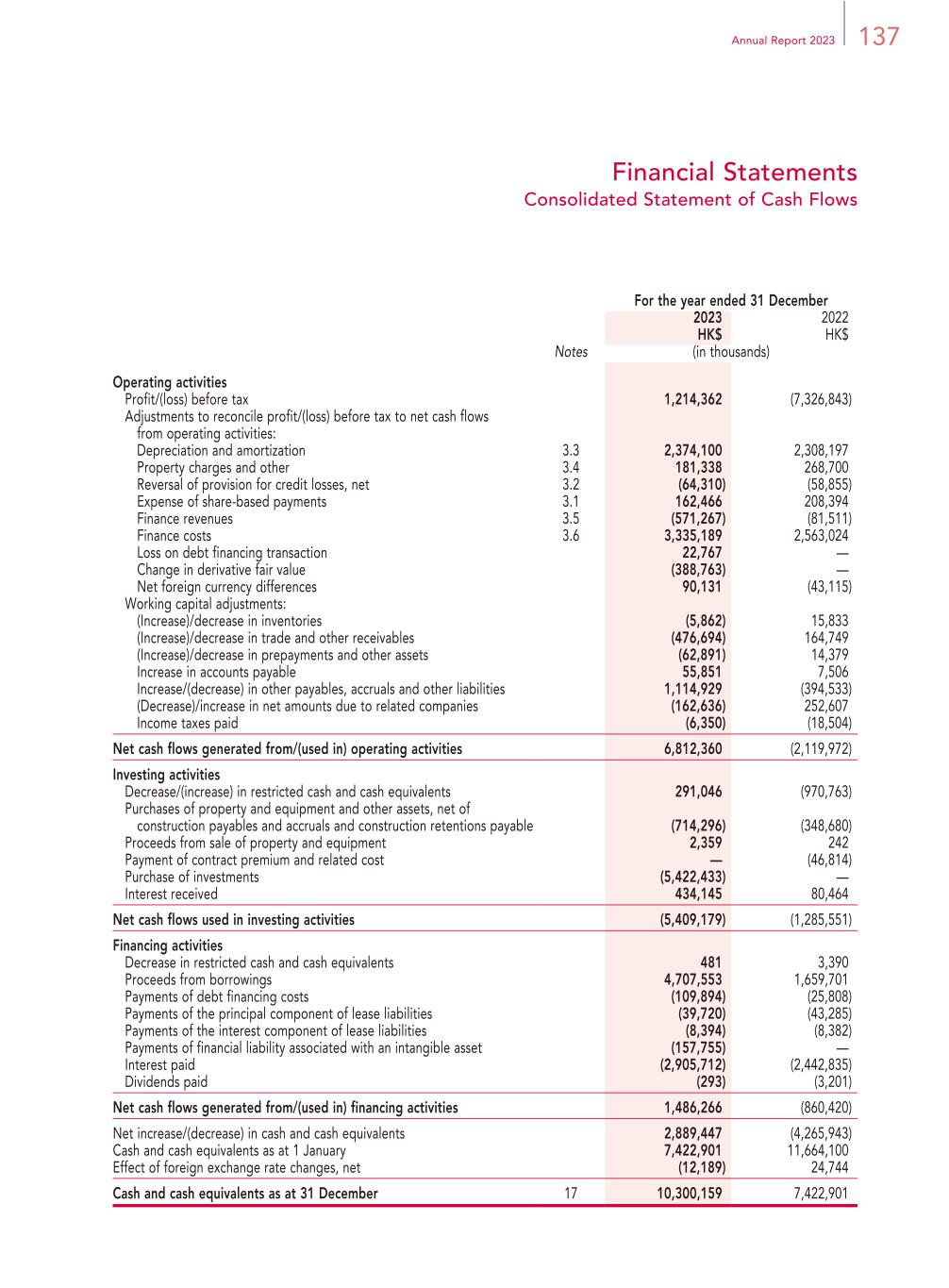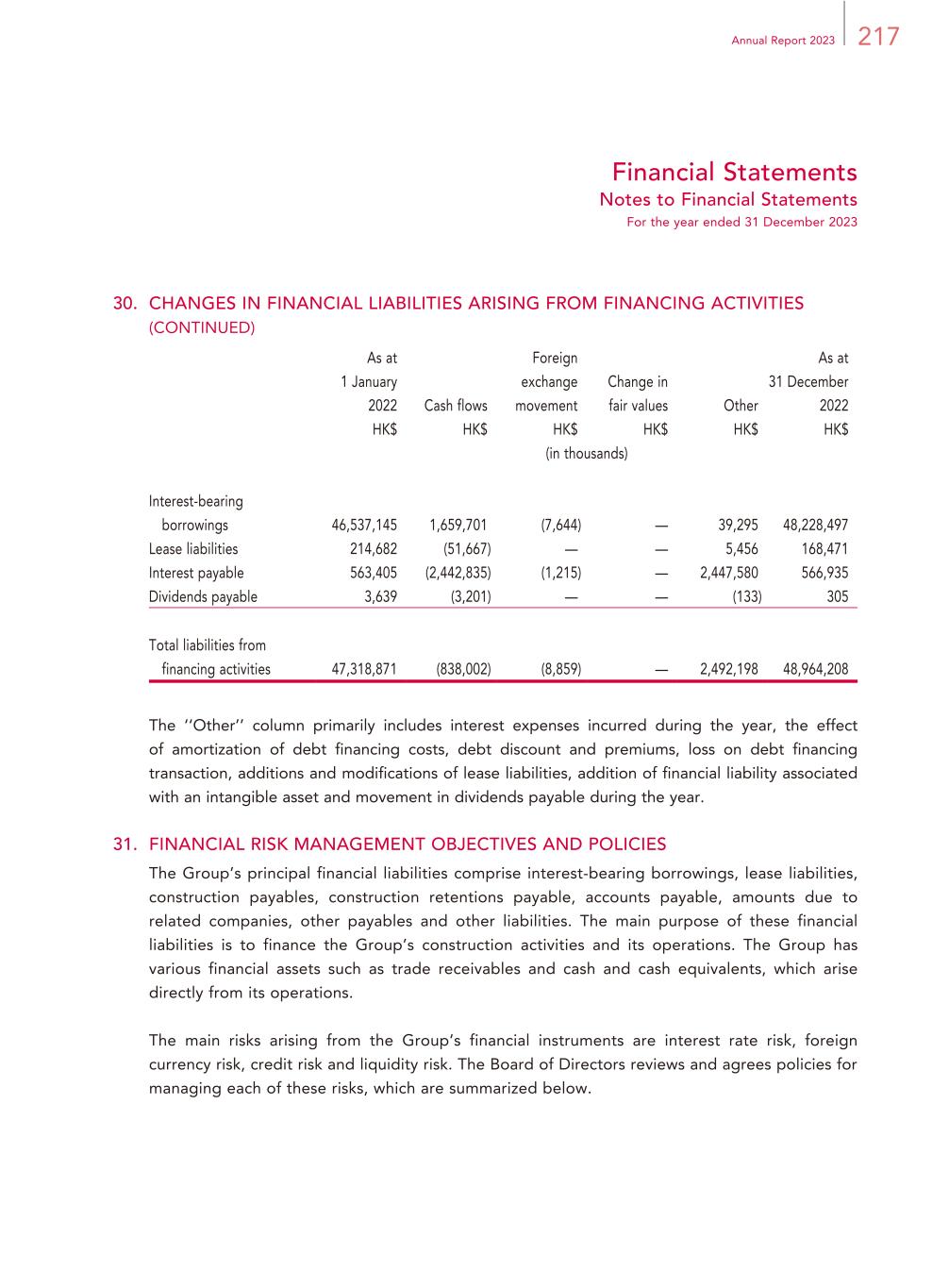 217Annual Report 2023 Financial Statements Notes to Financial Statements For the year ended 31 December 2023 30. CHANGES IN FINANCIAL LIABILITIES ARISING FROM FINANCING ACTIVITIES (CONTINUED) As at 1 January 2022 Cash flows Foreign exchange movement Change in fair values Other As at 31 December 2022 HK$ HK$ HK$ HK$ HK$ HK$ (in thousands) Interest-bearing borrowings 46,537,145 1,659,701 (7,644) — 39,295 48,228,497 Lease liabilities 214,682 (51,667) — — 5,456 168,471 Interest payable 563,405 (2,442,835) (1,215) — 2,447,580 566,935 Dividends payable 3,639 (3,201) — — (133) 305 Total liabilities from financing activities 47,318,871 (838,002) (8,859) — 2,492,198 48,964,208 The ‘‘Other’’ column primarily includes interest expenses incurred during the year, the effect of amortization of debt financing costs, debt discount and premiums, loss on debt financing transaction, additions and modifications of lease liabilities, addition of financial liability associated with an intangible asset and movement in dividends payable during the year. 31. FINANCIAL RISK MANAGEMENT OBJECTIVES AND POLICIES The Group’s principal financial liabilities comprise interest-bearing borrowings, lease liabilities, construction payables, construction retentions payable, accounts payable, amounts due to related companies, other payables and other liabilities. The main purpose of these financial liabilities is to finance the Group’s construction activities and its operations. The Group has various financial assets such as trade receivables and cash and cash equivalents, which arise directly from its operations. The main risks arising from the Group’s financial instruments are interest rate risk, foreign currency risk, credit risk and liquidity risk. The Board of Directors reviews and agrees policies for managing each of these risks, which are summarized below.