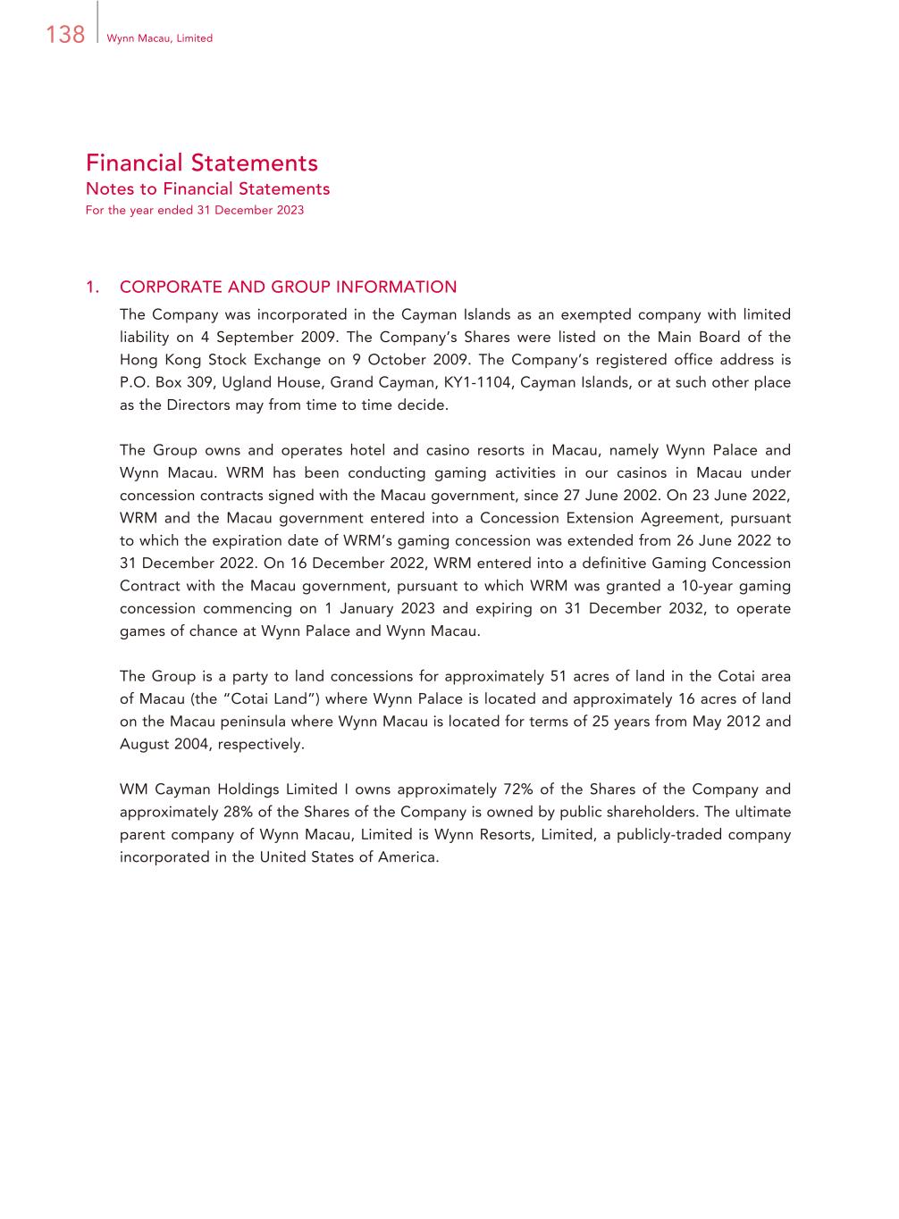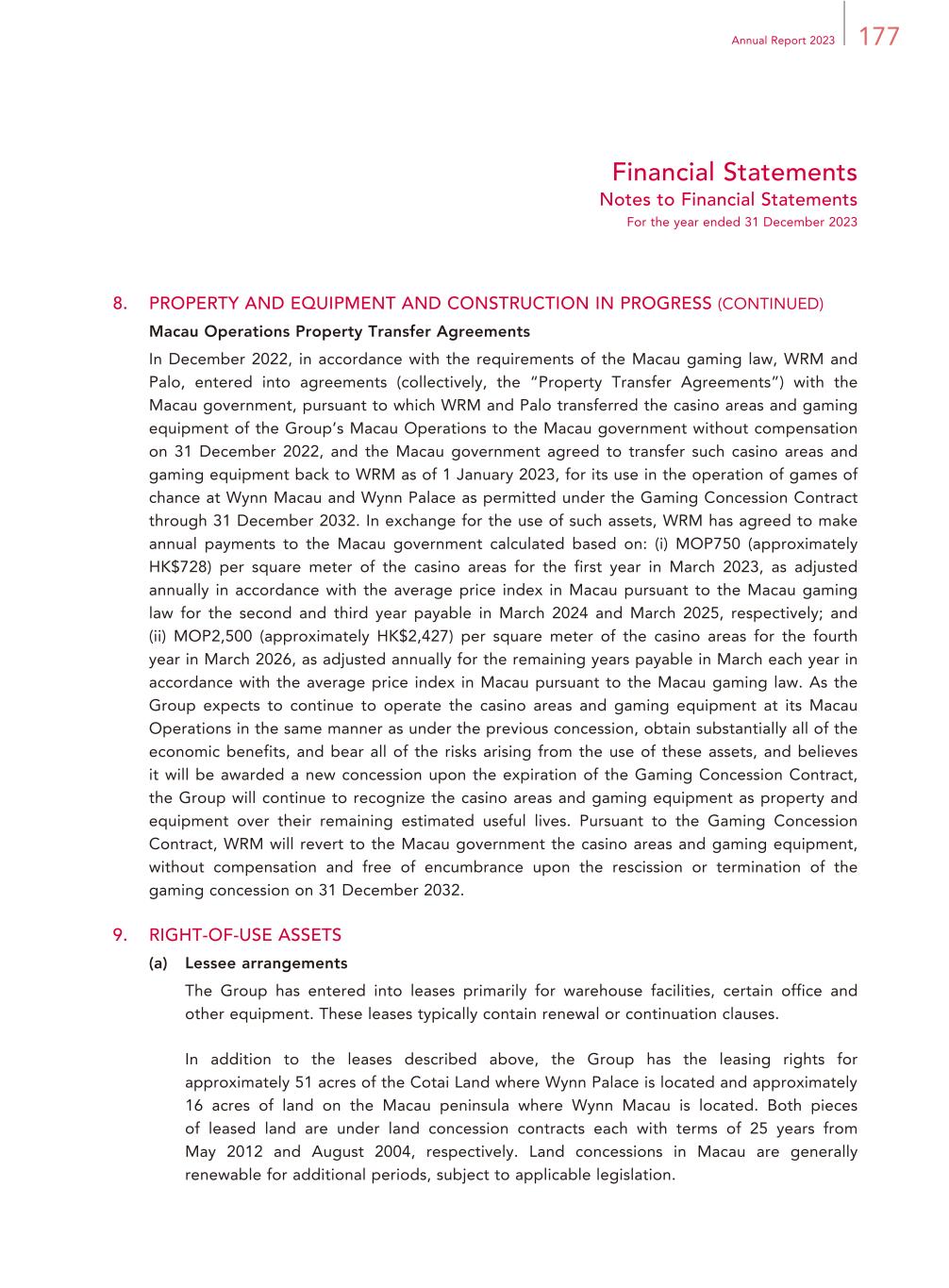 177Annual Report 2023 Financial Statements Notes to Financial Statements For the year ended 31 December 2023 8. PROPERTY AND EQUIPMENT AND CONSTRUCTION IN PROGRESS (CONTINUED) Macau Operations Property Transfer Agreements In December 2022, in accordance with the requirements of the Macau gaming law, WRM and Palo, entered into agreements (collectively, the “Property Transfer Agreements”) with the Macau government, pursuant to which WRM and Palo transferred the casino areas and gaming equipment of the Group’s Macau Operations to the Macau government without compensation on 31 December 2022, and the Macau government agreed to transfer such casino areas and gaming equipment back to WRM as of 1 January 2023, for its use in the operation of games of chance at Wynn Macau and Wynn Palace as permitted under the Gaming Concession Contract through 31 December 2032. In exchange for the use of such assets, WRM has agreed to make annual payments to the Macau government calculated based on: (i) MOP750 (approximately HK$728) per square meter of the casino areas for the first year in March 2023, as adjusted annually in accordance with the average price index in Macau pursuant to the Macau gaming law for the second and third year payable in March 2024 and March 2025, respectively; and (ii) MOP2,500 (approximately HK$2,427) per square meter of the casino areas for the fourth year in March 2026, as adjusted annually for the remaining years payable in March each year in accordance with the average price index in Macau pursuant to the Macau gaming law. As the Group expects to continue to operate the casino areas and gaming equipment at its Macau Operations in the same manner as under the previous concession, obtain substantially all of the economic benefits, and bear all of the risks arising from the use of these assets, and believes it will be awarded a new concession upon the expiration of the Gaming Concession Contract, the Group will continue to recognize the casino areas and gaming equipment as property and equipment over their remaining estimated useful lives. Pursuant to the Gaming Concession Contract, WRM will revert to the Macau government the casino areas and gaming equipment, without compensation and free of encumbrance upon the rescission or termination of the gaming concession on 31 December 2032. 9. RIGHT-OF-USE ASSETS (a) Lessee arrangements The Group has entered into leases primarily for warehouse facilities, certain office and other equipment. These leases typically contain renewal or continuation clauses. In addition to the leases described above, the Group has the leasing rights for approximately 51 acres of the Cotai Land where Wynn Palace is located and approximately 16 acres of land on the Macau peninsula where Wynn Macau is located. Both pieces of leased land are under land concession contracts each with terms of 25 years from May 2012 and August 2004, respectively. Land concessions in Macau are generally renewable for additional periods, subject to applicable legislation.