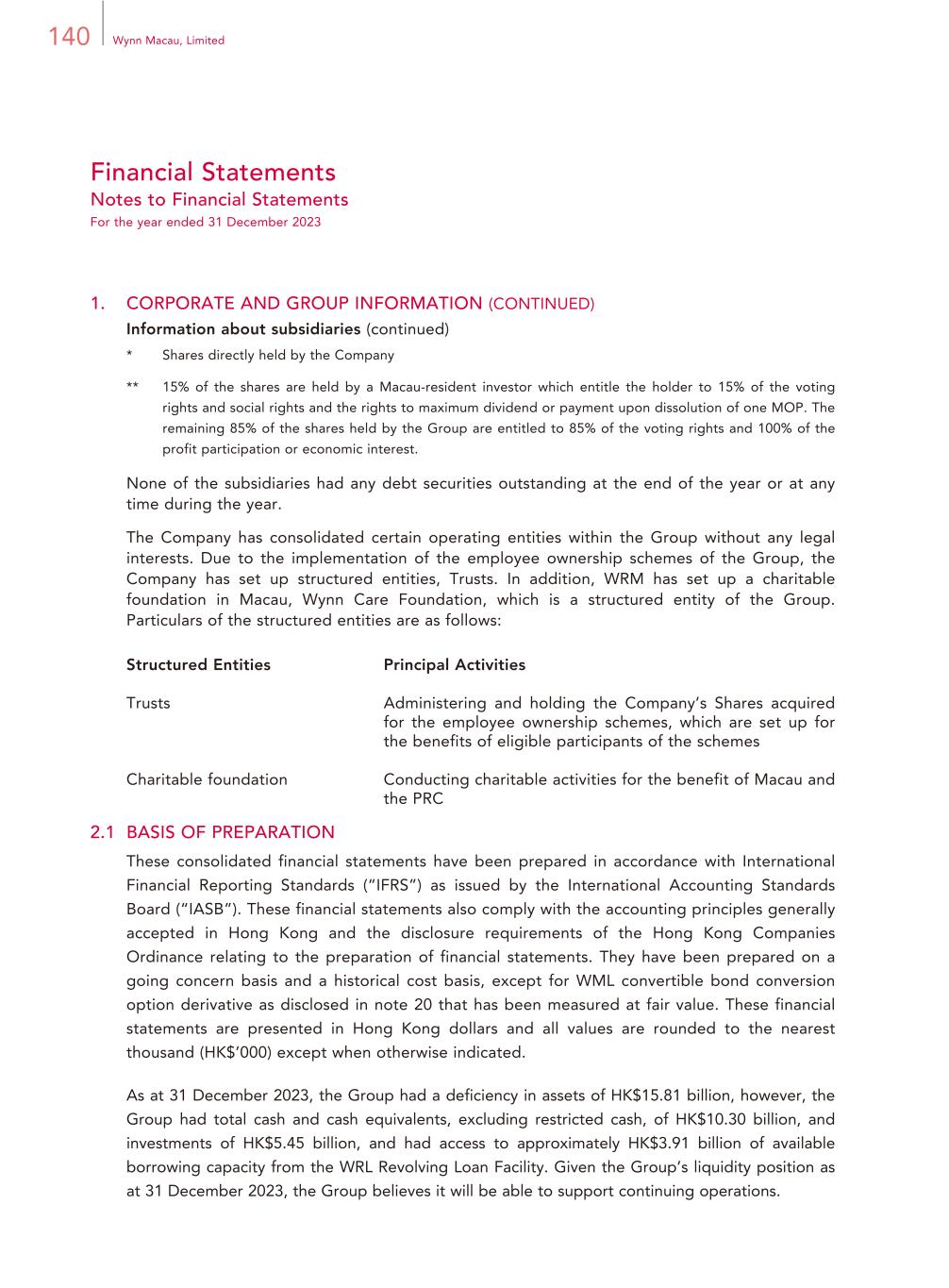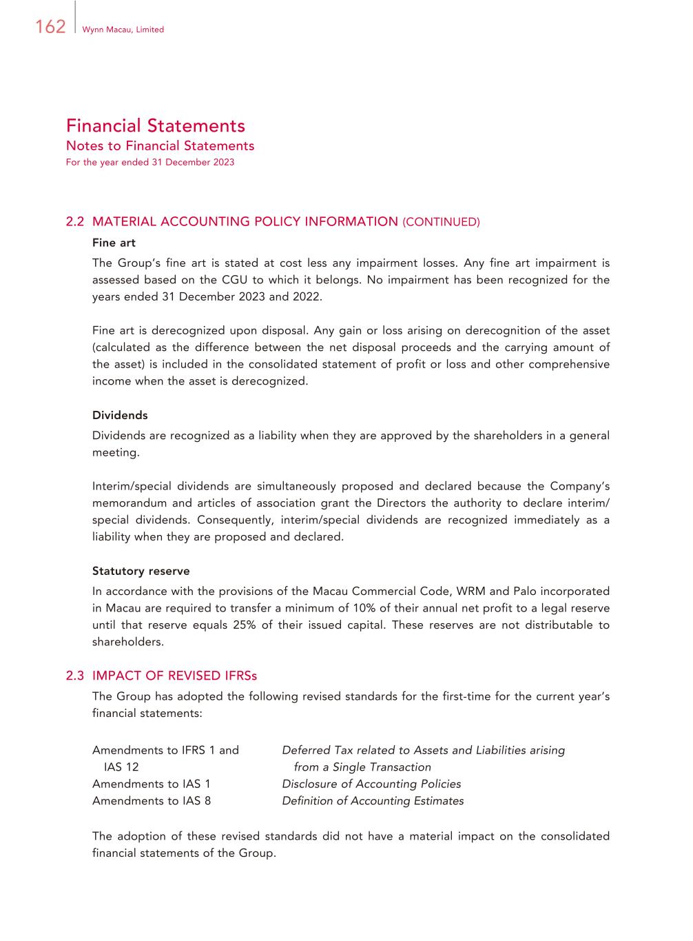 162 Wynn Macau, Limited Financial Statements Notes to Financial Statements For the year ended 31 December 2023 2.2 MATERIAL ACCOUNTING POLICY INFORMATION (CONTINUED) Fine art The Group’s fine art is stated at cost less any impairment losses. Any fine art impairment is assessed based on the CGU to which it belongs. No impairment has been recognized for the years ended 31 December 2023 and 2022. Fine art is derecognized upon disposal. Any gain or loss arising on derecognition of the asset (calculated as the difference between the net disposal proceeds and the carrying amount of the asset) is included in the consolidated statement of profit or loss and other comprehensive income when the asset is derecognized. Dividends Dividends are recognized as a liability when they are approved by the shareholders in a general meeting. Interim/special dividends are simultaneously proposed and declared because the Company’s memorandum and articles of association grant the Directors the authority to declare interim/ special dividends. Consequently, interim/special dividends are recognized immediately as a liability when they are proposed and declared. Statutory reserve In accordance with the provisions of the Macau Commercial Code, WRM and Palo incorporated in Macau are required to transfer a minimum of 10% of their annual net profit to a legal reserve until that reserve equals 25% of their issued capital. These reserves are not distributable to shareholders. 2.3 IMPACT OF REVISED IFRSs The Group has adopted the following revised standards for the first-time for the current year’s financial statements: Amendments to IFRS 1 and IAS 12 Deferred Tax related to Assets and Liabilities arising from a Single Transaction Amendments to IAS 1 Disclosure of Accounting Policies Amendments to IAS 8 Definition of Accounting Estimates The adoption of these revised standards did not have a material impact on the consolidated financial statements of the Group.