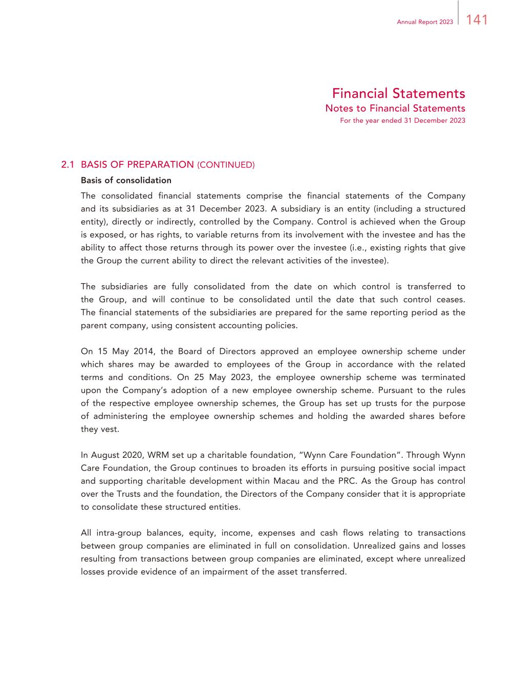 155Annual Report 2023 Financial Statements Notes to Financial Statements For the year ended 31 December 2023 2.2 MATERIAL ACCOUNTING POLICY INFORMATION (CONTINUED) Share-based payments Employees (including senior executives and directors) of the Group receive remuneration in the form of share-based payments; whereby, employees render services as consideration for equity instruments in the form of common shares or options to purchase common shares of the ultimate parent company, Wynn Resorts, and beginning in September 2009, the Company. In situations where equity instruments are issued and some or all of the goods or services received by the entity as consideration cannot be specifically identified, they are measured as the difference between the fair value of the share-based payment transactions and the fair value of any identifiable goods or services received at the grant date. This is then capitalized or expensed as appropriate. Equity-settled transactions The cost of equity-settled transactions with employees is measured by reference to the fair value at the date on which they are granted. The fair value is determined by using an appropriate pricing model, further details of which are given in note 24. The cost of equity-settled transactions is recognized in employee benefit expense, together with a corresponding increase in equity, over the period in which the performance and/or service conditions are fulfilled, ending on the date on which the relevant employees become fully entitled to the award (the “vesting date”). The cumulative expense recognized for equity- settled transactions at each reporting date until the vesting date reflects the extent to which the vesting period has expired and the Group’s best estimate of the number of equity instruments that will ultimately vest. The charge or credit to the consolidated statement of profit or loss and other comprehensive income for a period represents the movement in cumulative expense recognized as at the beginning and end of that period and is recognized in staff costs. Service and non-market performance conditions are not taken into account when determining the grant date fair value of awards, but the likelihood of the conditions being met is assessed as part of the Group’s best estimate of the number of equity instruments that will ultimately vest. Market performance conditions are reflected within the grant date fair value. Any other conditions attached to an award, but without an associated service requirement, are non-vesting conditions. Non-vesting conditions are reflected in the fair value of an award and lead to an immediate expensing of an award unless there are also service and/or performance conditions.