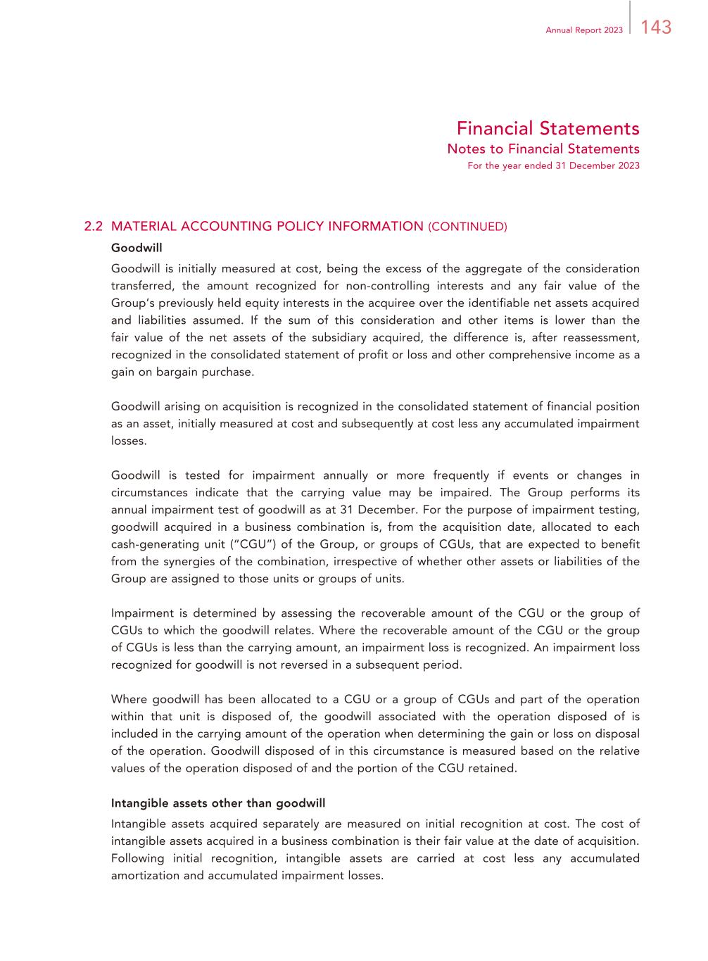 143Annual Report 2023 Financial Statements Notes to Financial Statements For the year ended 31 December 2023 2.2 MATERIAL ACCOUNTING POLICY INFORMATION (CONTINUED) Goodwill Goodwill is initially measured at cost, being the excess of the aggregate of the consideration transferred, the amount recognized for non-controlling interests and any fair value of the Group’s previously held equity interests in the acquiree over the identifiable net assets acquired and liabilities assumed. If the sum of this consideration and other items is lower than the fair value of the net assets of the subsidiary acquired, the difference is, after reassessment, recognized in the consolidated statement of profit or loss and other comprehensive income as a gain on bargain purchase. Goodwill arising on acquisition is recognized in the consolidated statement of financial position as an asset, initially measured at cost and subsequently at cost less any accumulated impairment losses. Goodwill is tested for impairment annually or more frequently if events or changes in circumstances indicate that the carrying value may be impaired. The Group performs its annual impairment test of goodwill as at 31 December. For the purpose of impairment testing, goodwill acquired in a business combination is, from the acquisition date, allocated to each cash-generating unit (“CGU”) of the Group, or groups of CGUs, that are expected to benefit from the synergies of the combination, irrespective of whether other assets or liabilities of the Group are assigned to those units or groups of units. Impairment is determined by assessing the recoverable amount of the CGU or the group of CGUs to which the goodwill relates. Where the recoverable amount of the CGU or the group of CGUs is less than the carrying amount, an impairment loss is recognized. An impairment loss recognized for goodwill is not reversed in a subsequent period. Where goodwill has been allocated to a CGU or a group of CGUs and part of the operation within that unit is disposed of, the goodwill associated with the operation disposed of is included in the carrying amount of the operation when determining the gain or loss on disposal of the operation. Goodwill disposed of in this circumstance is measured based on the relative values of the operation disposed of and the portion of the CGU retained. Intangible assets other than goodwill Intangible assets acquired separately are measured on initial recognition at cost. The cost of intangible assets acquired in a business combination is their fair value at the date of acquisition. Following initial recognition, intangible assets are carried at cost less any accumulated amortization and accumulated impairment losses.