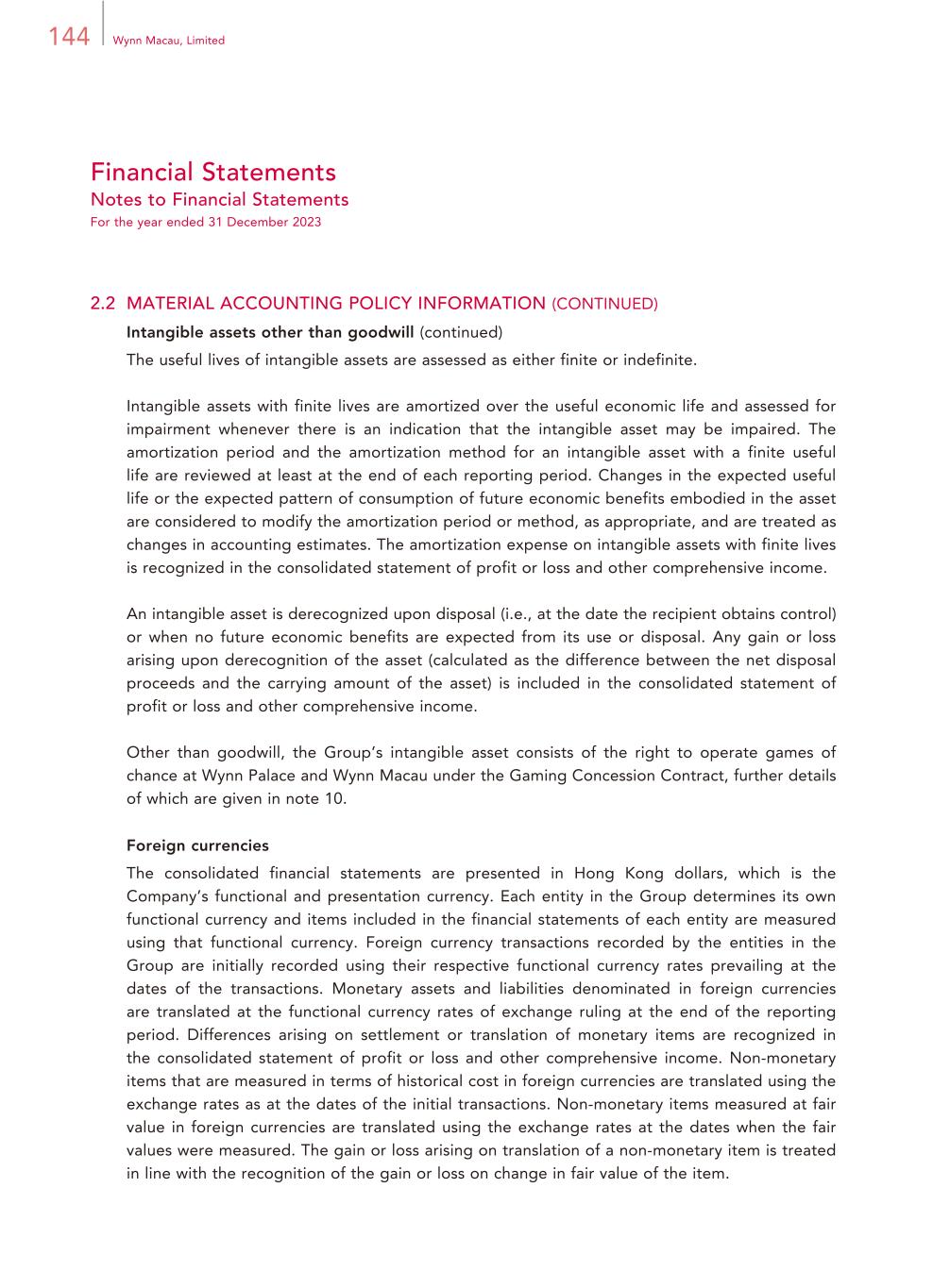 144 Wynn Macau, Limited Financial Statements Notes to Financial Statements For the year ended 31 December 2023 2.2 MATERIAL ACCOUNTING POLICY INFORMATION (CONTINUED) Intangible assets other than goodwill (continued) The useful lives of intangible assets are assessed as either finite or indefinite. Intangible assets with finite lives are amortized over the useful economic life and assessed for impairment whenever there is an indication that the intangible asset may be impaired. The amortization period and the amortization method for an intangible asset with a finite useful life are reviewed at least at the end of each reporting period. Changes in the expected useful life or the expected pattern of consumption of future economic benefits embodied in the asset are considered to modify the amortization period or method, as appropriate, and are treated as changes in accounting estimates. The amortization expense on intangible assets with finite lives is recognized in the consolidated statement of profit or loss and other comprehensive income. An intangible asset is derecognized upon disposal (i.e., at the date the recipient obtains control) or when no future economic benefits are expected from its use or disposal. Any gain or loss arising upon derecognition of the asset (calculated as the difference between the net disposal proceeds and the carrying amount of the asset) is included in the consolidated statement of profit or loss and other comprehensive income. Other than goodwill, the Group’s intangible asset consists of the right to operate games of chance at Wynn Palace and Wynn Macau under the Gaming Concession Contract, further details of which are given in note 10. Foreign currencies The consolidated financial statements are presented in Hong Kong dollars, which is the Company’s functional and presentation currency. Each entity in the Group determines its own functional currency and items included in the financial statements of each entity are measured using that functional currency. Foreign currency transactions recorded by the entities in the Group are initially recorded using their respective functional currency rates prevailing at the dates of the transactions. Monetary assets and liabilities denominated in foreign currencies are translated at the functional currency rates of exchange ruling at the end of the reporting period. Differences arising on settlement or translation of monetary items are recognized in the consolidated statement of profit or loss and other comprehensive income. Non-monetary items that are measured in terms of historical cost in foreign currencies are translated using the exchange rates as at the dates of the initial transactions. Non-monetary items measured at fair value in foreign currencies are translated using the exchange rates at the dates when the fair values were measured. The gain or loss arising on translation of a non-monetary item is treated in line with the recognition of the gain or loss on change in fair value of the item.
