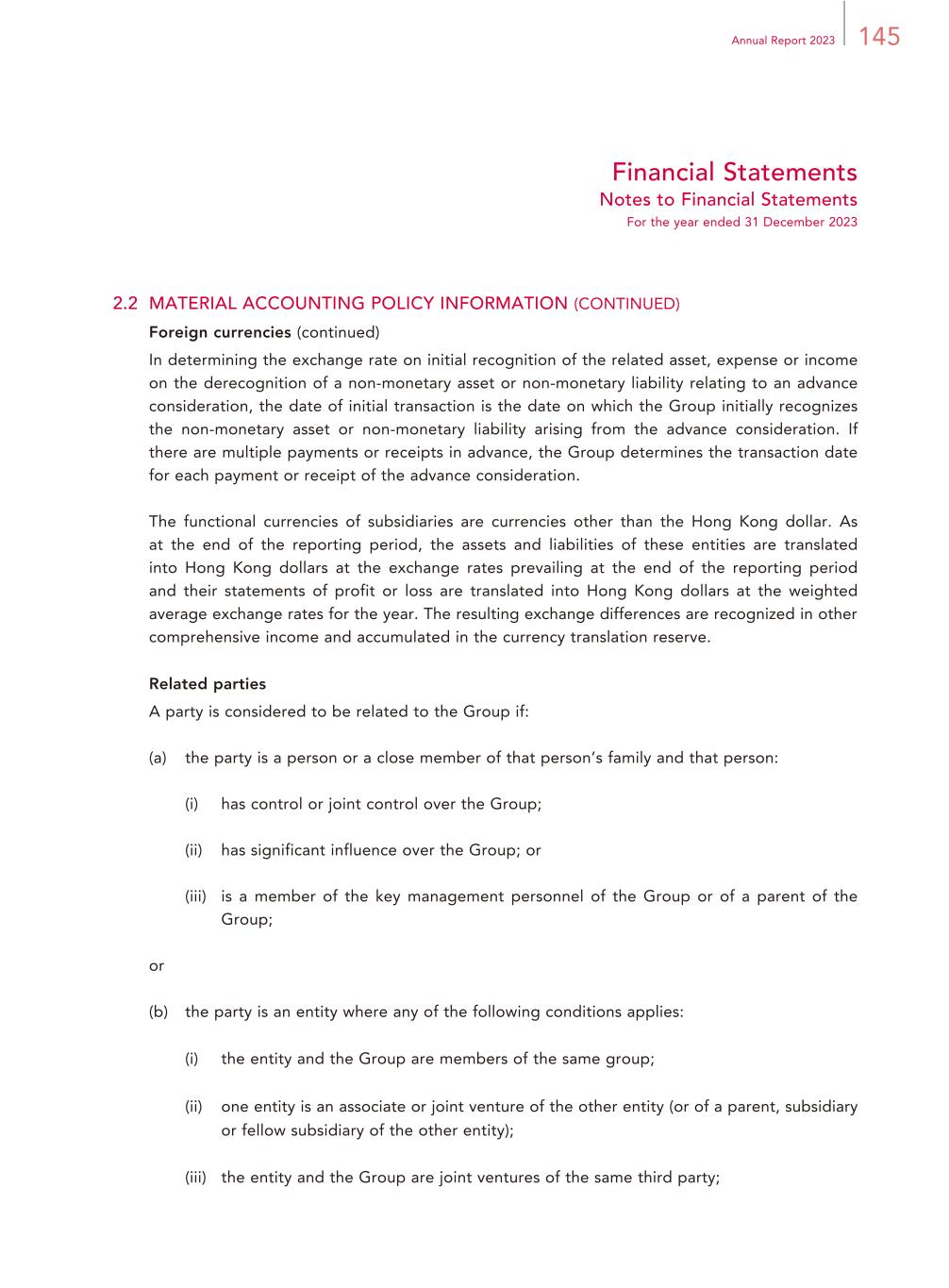 145Annual Report 2023 Financial Statements Notes to Financial Statements For the year ended 31 December 2023 2.2 MATERIAL ACCOUNTING POLICY INFORMATION (CONTINUED) Foreign currencies (continued) In determining the exchange rate on initial recognition of the related asset, expense or income on the derecognition of a non-monetary asset or non-monetary liability relating to an advance consideration, the date of initial transaction is the date on which the Group initially recognizes the non-monetary asset or non-monetary liability arising from the advance consideration. If there are multiple payments or receipts in advance, the Group determines the transaction date for each payment or receipt of the advance consideration. The functional currencies of subsidiaries are currencies other than the Hong Kong dollar. As at the end of the reporting period, the assets and liabilities of these entities are translated into Hong Kong dollars at the exchange rates prevailing at the end of the reporting period and their statements of profit or loss are translated into Hong Kong dollars at the weighted average exchange rates for the year. The resulting exchange differences are recognized in other comprehensive income and accumulated in the currency translation reserve. Related parties A party is considered to be related to the Group if: (a) the party is a person or a close member of that person’s family and that person: (i) has control or joint control over the Group; (ii) has significant influence over the Group; or (iii) is a member of the key management personnel of the Group or of a parent of the Group; or (b) the party is an entity where any of the following conditions applies: (i) the entity and the Group are members of the same group; (ii) one entity is an associate or joint venture of the other entity (or of a parent, subsidiary or fellow subsidiary of the other entity); (iii) the entity and the Group are joint ventures of the same third party;