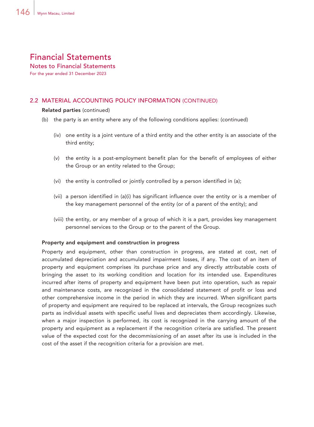 146 Wynn Macau, Limited Financial Statements Notes to Financial Statements For the year ended 31 December 2023 2.2 MATERIAL ACCOUNTING POLICY INFORMATION (CONTINUED) Related parties (continued) (b) the party is an entity where any of the following conditions applies: (continued) (iv) one entity is a joint venture of a third entity and the other entity is an associate of the third entity; (v) the entity is a post-employment benefit plan for the benefit of employees of either the Group or an entity related to the Group; (vi) the entity is controlled or jointly controlled by a person identified in (a); (vii) a person identified in (a)(i) has significant influence over the entity or is a member of the key management personnel of the entity (or of a parent of the entity); and (viii) the entity, or any member of a group of which it is a part, provides key management personnel services to the Group or to the parent of the Group. Property and equipment and construction in progress Property and equipment, other than construction in progress, are stated at cost, net of accumulated depreciation and accumulated impairment losses, if any. The cost of an item of property and equipment comprises its purchase price and any directly attributable costs of bringing the asset to its working condition and location for its intended use. Expenditures incurred after items of property and equipment have been put into operation, such as repair and maintenance costs, are recognized in the consolidated statement of profit or loss and other comprehensive income in the period in which they are incurred. When significant parts of property and equipment are required to be replaced at intervals, the Group recognizes such parts as individual assets with specific useful lives and depreciates them accordingly. Likewise, when a major inspection is performed, its cost is recognized in the carrying amount of the property and equipment as a replacement if the recognition criteria are satisfied. The present value of the expected cost for the decommissioning of an asset after its use is included in the cost of the asset if the recognition criteria for a provision are met.