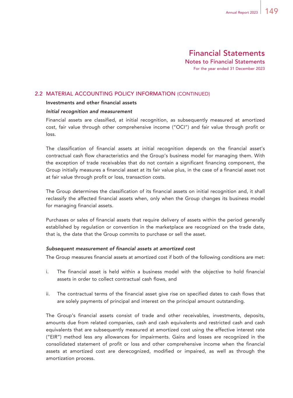 149Annual Report 2023 Financial Statements Notes to Financial Statements For the year ended 31 December 2023 2.2 MATERIAL ACCOUNTING POLICY INFORMATION (CONTINUED) Investments and other financial assets Initial recognition and measurement Financial assets are classified, at initial recognition, as subsequently measured at amortized cost, fair value through other comprehensive income (“OCI”) and fair value through profit or loss. The classification of financial assets at initial recognition depends on the financial asset’s contractual cash flow characteristics and the Group’s business model for managing them. With the exception of trade receivables that do not contain a significant financing component, the Group initially measures a financial asset at its fair value plus, in the case of a financial asset not at fair value through profit or loss, transaction costs. The Group determines the classification of its financial assets on initial recognition and, it shall reclassify the affected financial assets when, only when the Group changes its business model for managing financial assets. Purchases or sales of financial assets that require delivery of assets within the period generally established by regulation or convention in the marketplace are recognized on the trade date, that is, the date that the Group commits to purchase or sell the asset. Subsequent measurement of financial assets at amortized cost The Group measures financial assets at amortized cost if both of the following conditions are met: i. The financial asset is held within a business model with the objective to hold financial assets in order to collect contractual cash flows, and ii. The contractual terms of the financial asset give rise on specified dates to cash flows that are solely payments of principal and interest on the principal amount outstanding. The Group’s financial assets consist of trade and other receivables, investments, deposits, amounts due from related companies, cash and cash equivalents and restricted cash and cash equivalents that are subsequently measured at amortized cost using the effective interest rate (“EIR”) method less any allowances for impairments. Gains and losses are recognized in the consolidated statement of profit or loss and other comprehensive income when the financial assets at amortized cost are derecognized, modified or impaired, as well as through the amortization process.