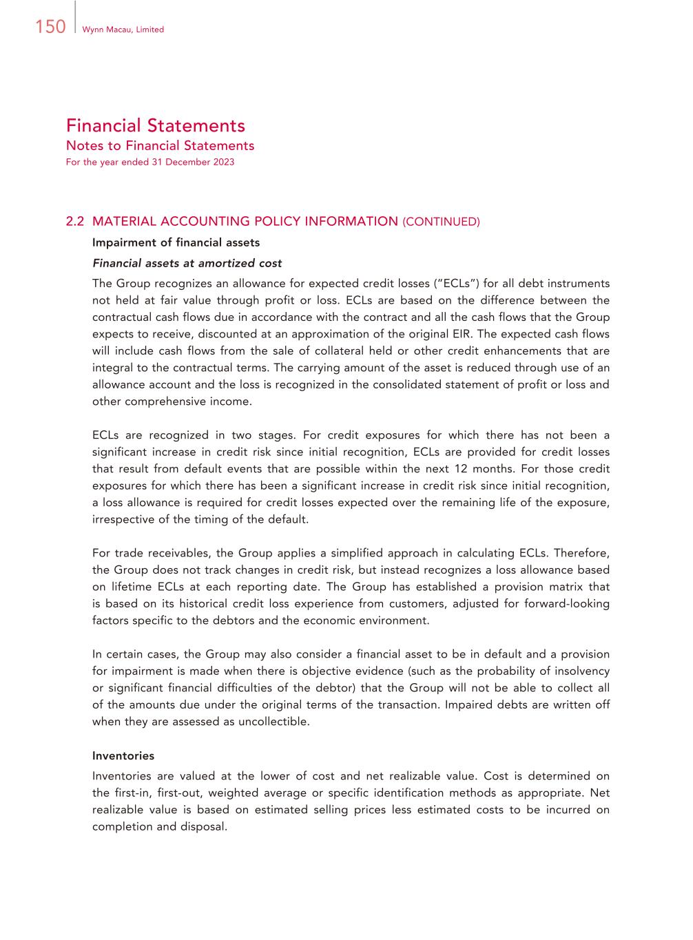 150 Wynn Macau, Limited Financial Statements Notes to Financial Statements For the year ended 31 December 2023 2.2 MATERIAL ACCOUNTING POLICY INFORMATION (CONTINUED) Impairment of financial assets Financial assets at amortized cost The Group recognizes an allowance for expected credit losses (“ECLs”) for all debt instruments not held at fair value through profit or loss. ECLs are based on the difference between the contractual cash flows due in accordance with the contract and all the cash flows that the Group expects to receive, discounted at an approximation of the original EIR. The expected cash flows will include cash flows from the sale of collateral held or other credit enhancements that are integral to the contractual terms. The carrying amount of the asset is reduced through use of an allowance account and the loss is recognized in the consolidated statement of profit or loss and other comprehensive income. ECLs are recognized in two stages. For credit exposures for which there has not been a significant increase in credit risk since initial recognition, ECLs are provided for credit losses that result from default events that are possible within the next 12 months. For those credit exposures for which there has been a significant increase in credit risk since initial recognition, a loss allowance is required for credit losses expected over the remaining life of the exposure, irrespective of the timing of the default. For trade receivables, the Group applies a simplified approach in calculating ECLs. Therefore, the Group does not track changes in credit risk, but instead recognizes a loss allowance based on lifetime ECLs at each reporting date. The Group has established a provision matrix that is based on its historical credit loss experience from customers, adjusted for forward-looking factors specific to the debtors and the economic environment. In certain cases, the Group may also consider a financial asset to be in default and a provision for impairment is made when there is objective evidence (such as the probability of insolvency or significant financial difficulties of the debtor) that the Group will not be able to collect all of the amounts due under the original terms of the transaction. Impaired debts are written off when they are assessed as uncollectible. Inventories Inventories are valued at the lower of cost and net realizable value. Cost is determined on the first-in, first-out, weighted average or specific identification methods as appropriate. Net realizable value is based on estimated selling prices less estimated costs to be incurred on completion and disposal.