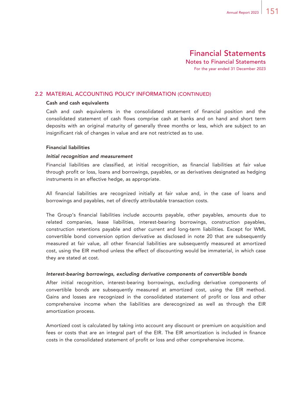 151Annual Report 2023 Financial Statements Notes to Financial Statements For the year ended 31 December 2023 2.2 MATERIAL ACCOUNTING POLICY INFORMATION (CONTINUED) Cash and cash equivalents Cash and cash equivalents in the consolidated statement of financial position and the consolidated statement of cash flows comprise cash at banks and on hand and short term deposits with an original maturity of generally three months or less, which are subject to an insignificant risk of changes in value and are not restricted as to use. Financial liabilities Initial recognition and measurement Financial liabilities are classified, at initial recognition, as financial liabilities at fair value through profit or loss, loans and borrowings, payables, or as derivatives designated as hedging instruments in an effective hedge, as appropriate. All financial liabilities are recognized initially at fair value and, in the case of loans and borrowings and payables, net of directly attributable transaction costs. The Group’s financial liabilities include accounts payable, other payables, amounts due to related companies, lease liabilities, interest-bearing borrowings, construction payables, construction retentions payable and other current and long-term liabilities. Except for WML convertible bond conversion option derivative as disclosed in note 20 that are subsequently measured at fair value, all other financial liabilities are subsequently measured at amortized cost, using the EIR method unless the effect of discounting would be immaterial, in which case they are stated at cost. Interest-bearing borrowings, excluding derivative components of convertible bonds After initial recognition, interest-bearing borrowings, excluding derivative components of convertible bonds are subsequently measured at amortized cost, using the EIR method. Gains and losses are recognized in the consolidated statement of profit or loss and other comprehensive income when the liabilities are derecognized as well as through the EIR amortization process. Amortized cost is calculated by taking into account any discount or premium on acquisition and fees or costs that are an integral part of the EIR. The EIR amortization is included in finance costs in the consolidated statement of profit or loss and other comprehensive income.
