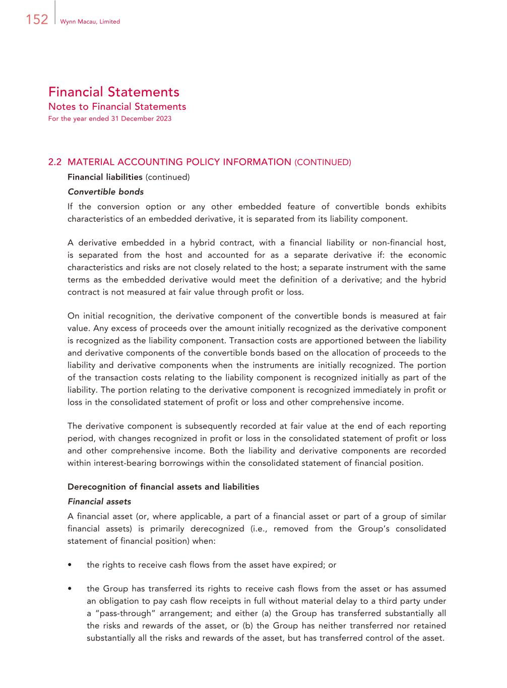 152 Wynn Macau, Limited Financial Statements Notes to Financial Statements For the year ended 31 December 2023 2.2 MATERIAL ACCOUNTING POLICY INFORMATION (CONTINUED) Financial liabilities (continued) Convertible bonds If the conversion option or any other embedded feature of convertible bonds exhibits characteristics of an embedded derivative, it is separated from its liability component. A derivative embedded in a hybrid contract, with a financial liability or non-financial host, is separated from the host and accounted for as a separate derivative if: the economic characteristics and risks are not closely related to the host; a separate instrument with the same terms as the embedded derivative would meet the definition of a derivative; and the hybrid contract is not measured at fair value through profit or loss. On initial recognition, the derivative component of the convertible bonds is measured at fair value. Any excess of proceeds over the amount initially recognized as the derivative component is recognized as the liability component. Transaction costs are apportioned between the liability and derivative components of the convertible bonds based on the allocation of proceeds to the liability and derivative components when the instruments are initially recognized. The portion of the transaction costs relating to the liability component is recognized initially as part of the liability. The portion relating to the derivative component is recognized immediately in profit or loss in the consolidated statement of profit or loss and other comprehensive income. The derivative component is subsequently recorded at fair value at the end of each reporting period, with changes recognized in profit or loss in the consolidated statement of profit or loss and other comprehensive income. Both the liability and derivative components are recorded within interest-bearing borrowings within the consolidated statement of financial position. Derecognition of financial assets and liabilities Financial assets A financial asset (or, where applicable, a part of a financial asset or part of a group of similar financial assets) is primarily derecognized (i.e., removed from the Group’s consolidated statement of financial position) when: • the rights to receive cash flows from the asset have expired; or • the Group has transferred its rights to receive cash flows from the asset or has assumed an obligation to pay cash flow receipts in full without material delay to a third party under a “pass-through” arrangement; and either (a) the Group has transferred substantially all the risks and rewards of the asset, or (b) the Group has neither transferred nor retained substantially all the risks and rewards of the asset, but has transferred control of the asset.