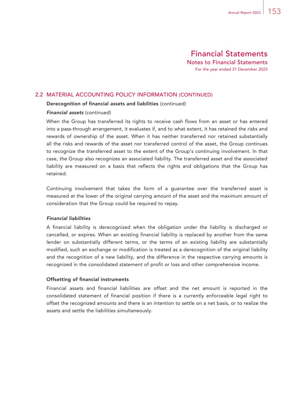 153Annual Report 2023 Financial Statements Notes to Financial Statements For the year ended 31 December 2023 2.2 MATERIAL ACCOUNTING POLICY INFORMATION (CONTINUED) Derecognition of financial assets and liabilities (continued) Financial assets (continued) When the Group has transferred its rights to receive cash flows from an asset or has entered into a pass-through arrangement, it evaluates if, and to what extent, it has retained the risks and rewards of ownership of the asset. When it has neither transferred nor retained substantially all the risks and rewards of the asset nor transferred control of the asset, the Group continues to recognize the transferred asset to the extent of the Group’s continuing involvement. In that case, the Group also recognizes an associated liability. The transferred asset and the associated liability are measured on a basis that reflects the rights and obligations that the Group has retained. Continuing involvement that takes the form of a guarantee over the transferred asset is measured at the lower of the original carrying amount of the asset and the maximum amount of consideration that the Group could be required to repay. Financial liabilities A financial liability is derecognized when the obligation under the liability is discharged or cancelled, or expires. When an existing financial liability is replaced by another from the same lender on substantially different terms, or the terms of an existing liability are substantially modified, such an exchange or modification is treated as a derecognition of the original liability and the recognition of a new liability, and the difference in the respective carrying amounts is recognized in the consolidated statement of profit or loss and other comprehensive income. Offsetting of financial instruments Financial assets and financial liabilities are offset and the net amount is reported in the consolidated statement of financial position if there is a currently enforceable legal right to offset the recognized amounts and there is an intention to settle on a net basis, or to realize the assets and settle the liabilities simultaneously.