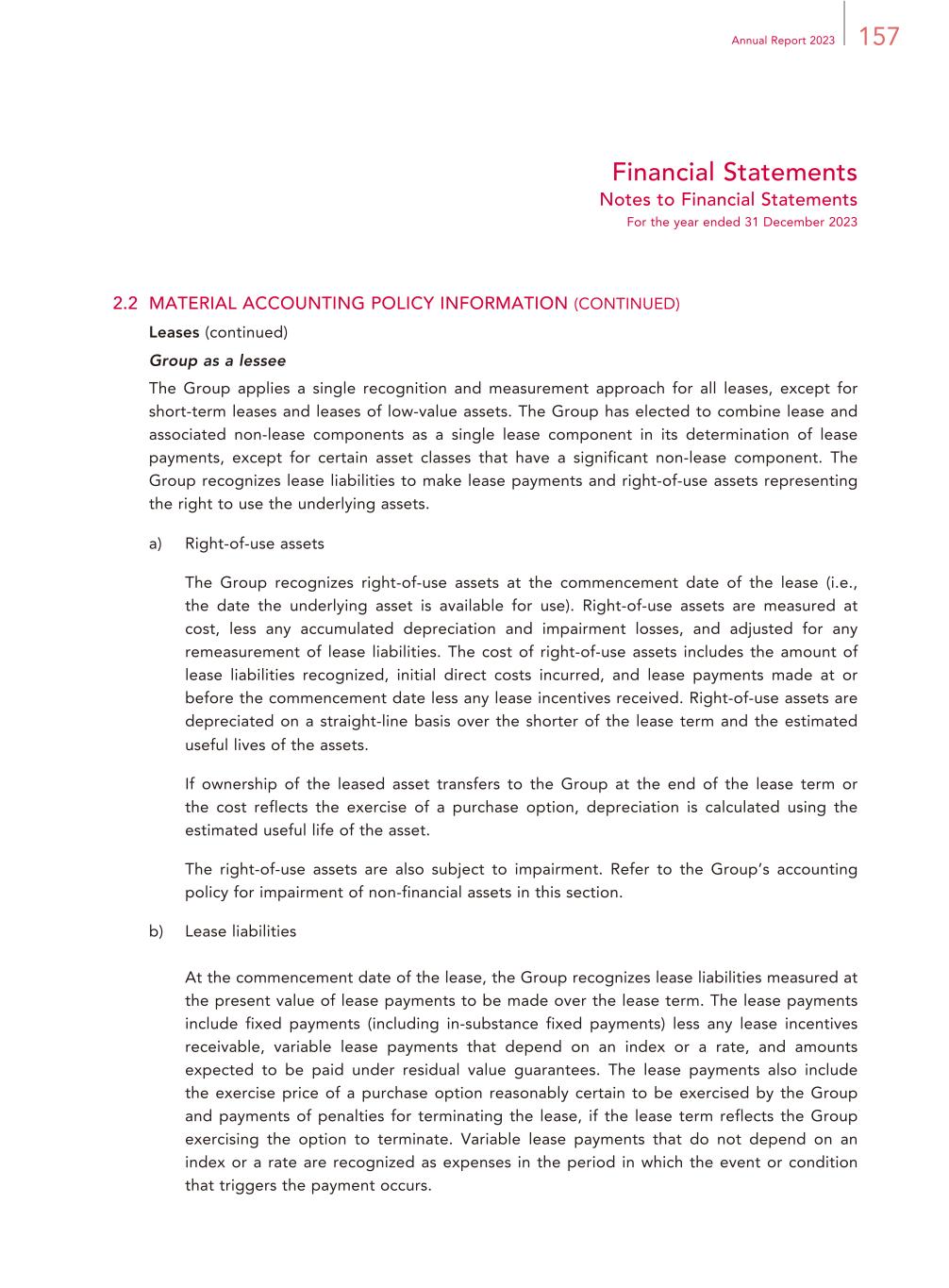 157Annual Report 2023 Financial Statements Notes to Financial Statements For the year ended 31 December 2023 2.2 MATERIAL ACCOUNTING POLICY INFORMATION (CONTINUED) Leases (continued) Group as a lessee The Group applies a single recognition and measurement approach for all leases, except for short-term leases and leases of low-value assets. The Group has elected to combine lease and associated non-lease components as a single lease component in its determination of lease payments, except for certain asset classes that have a significant non-lease component. The Group recognizes lease liabilities to make lease payments and right-of-use assets representing the right to use the underlying assets. a) Right-of-use assets The Group recognizes right-of-use assets at the commencement date of the lease (i.e., the date the underlying asset is available for use). Right-of-use assets are measured at cost, less any accumulated depreciation and impairment losses, and adjusted for any remeasurement of lease liabilities. The cost of right-of-use assets includes the amount of lease liabilities recognized, initial direct costs incurred, and lease payments made at or before the commencement date less any lease incentives received. Right-of-use assets are depreciated on a straight-line basis over the shorter of the lease term and the estimated useful lives of the assets. If ownership of the leased asset transfers to the Group at the end of the lease term or the cost reflects the exercise of a purchase option, depreciation is calculated using the estimated useful life of the asset. The right-of-use assets are also subject to impairment. Refer to the Group’s accounting policy for impairment of non-financial assets in this section. b) Lease liabilities At the commencement date of the lease, the Group recognizes lease liabilities measured at the present value of lease payments to be made over the lease term. The lease payments include fixed payments (including in-substance fixed payments) less any lease incentives receivable, variable lease payments that depend on an index or a rate, and amounts expected to be paid under residual value guarantees. The lease payments also include the exercise price of a purchase option reasonably certain to be exercised by the Group and payments of penalties for terminating the lease, if the lease term reflects the Group exercising the option to terminate. Variable lease payments that do not depend on an index or a rate are recognized as expenses in the period in which the event or condition that triggers the payment occurs.