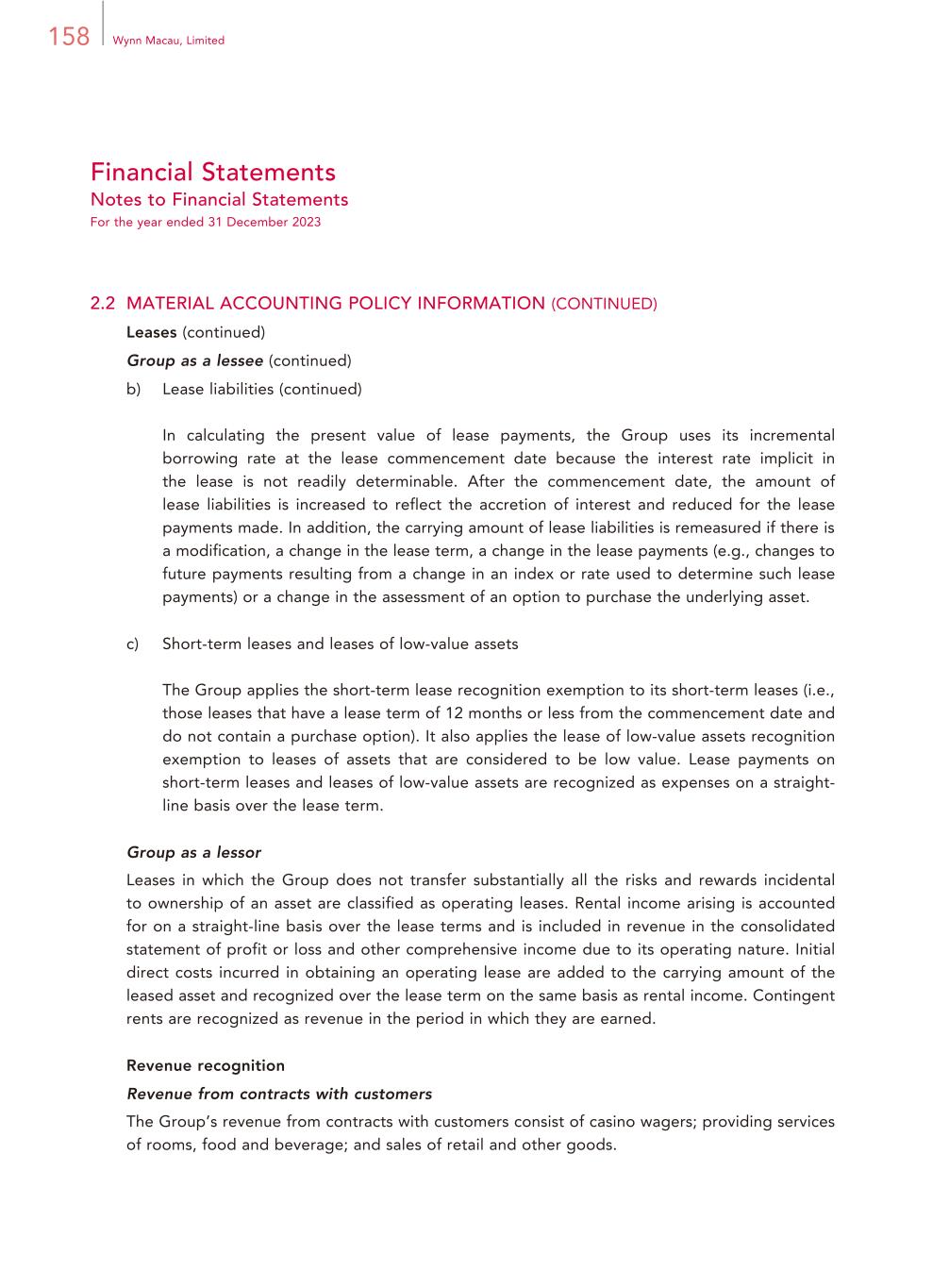 158 Wynn Macau, Limited Financial Statements Notes to Financial Statements For the year ended 31 December 2023 2.2 MATERIAL ACCOUNTING POLICY INFORMATION (CONTINUED) Leases (continued) Group as a lessee (continued) b) Lease liabilities (continued) In calculating the present value of lease payments, the Group uses its incremental borrowing rate at the lease commencement date because the interest rate implicit in the lease is not readily determinable. After the commencement date, the amount of lease liabilities is increased to reflect the accretion of interest and reduced for the lease payments made. In addition, the carrying amount of lease liabilities is remeasured if there is a modification, a change in the lease term, a change in the lease payments (e.g., changes to future payments resulting from a change in an index or rate used to determine such lease payments) or a change in the assessment of an option to purchase the underlying asset. c) Short-term leases and leases of low-value assets The Group applies the short-term lease recognition exemption to its short-term leases (i.e., those leases that have a lease term of 12 months or less from the commencement date and do not contain a purchase option). It also applies the lease of low-value assets recognition exemption to leases of assets that are considered to be low value. Lease payments on short-term leases and leases of low-value assets are recognized as expenses on a straight- line basis over the lease term. Group as a lessor Leases in which the Group does not transfer substantially all the risks and rewards incidental to ownership of an asset are classified as operating leases. Rental income arising is accounted for on a straight-line basis over the lease terms and is included in revenue in the consolidated statement of profit or loss and other comprehensive income due to its operating nature. Initial direct costs incurred in obtaining an operating lease are added to the carrying amount of the leased asset and recognized over the lease term on the same basis as rental income. Contingent rents are recognized as revenue in the period in which they are earned. Revenue recognition Revenue from contracts with customers The Group’s revenue from contracts with customers consist of casino wagers; providing services of rooms, food and beverage; and sales of retail and other goods.