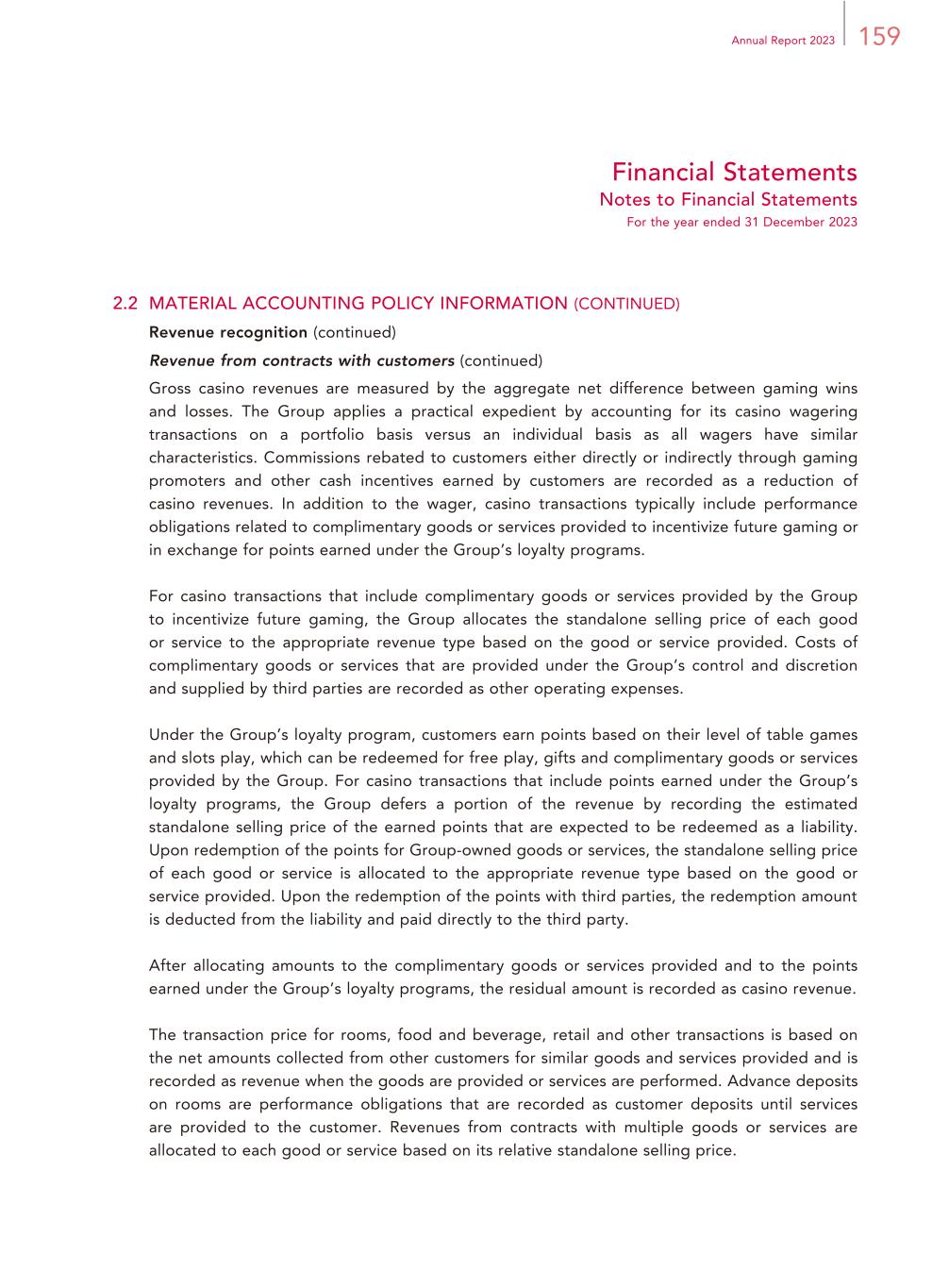 159Annual Report 2023 Financial Statements Notes to Financial Statements For the year ended 31 December 2023 2.2 MATERIAL ACCOUNTING POLICY INFORMATION (CONTINUED) Revenue recognition (continued) Revenue from contracts with customers (continued) Gross casino revenues are measured by the aggregate net difference between gaming wins and losses. The Group applies a practical expedient by accounting for its casino wagering transactions on a portfolio basis versus an individual basis as all wagers have similar characteristics. Commissions rebated to customers either directly or indirectly through gaming promoters and other cash incentives earned by customers are recorded as a reduction of casino revenues. In addition to the wager, casino transactions typically include performance obligations related to complimentary goods or services provided to incentivize future gaming or in exchange for points earned under the Group’s loyalty programs. For casino transactions that include complimentary goods or services provided by the Group to incentivize future gaming, the Group allocates the standalone selling price of each good or service to the appropriate revenue type based on the good or service provided. Costs of complimentary goods or services that are provided under the Group’s control and discretion and supplied by third parties are recorded as other operating expenses. Under the Group’s loyalty program, customers earn points based on their level of table games and slots play, which can be redeemed for free play, gifts and complimentary goods or services provided by the Group. For casino transactions that include points earned under the Group’s loyalty programs, the Group defers a portion of the revenue by recording the estimated standalone selling price of the earned points that are expected to be redeemed as a liability. Upon redemption of the points for Group-owned goods or services, the standalone selling price of each good or service is allocated to the appropriate revenue type based on the good or service provided. Upon the redemption of the points with third parties, the redemption amount is deducted from the liability and paid directly to the third party. After allocating amounts to the complimentary goods or services provided and to the points earned under the Group’s loyalty programs, the residual amount is recorded as casino revenue. The transaction price for rooms, food and beverage, retail and other transactions is based on the net amounts collected from other customers for similar goods and services provided and is recorded as revenue when the goods are provided or services are performed. Advance deposits on rooms are performance obligations that are recorded as customer deposits until services are provided to the customer. Revenues from contracts with multiple goods or services are allocated to each good or service based on its relative standalone selling price.