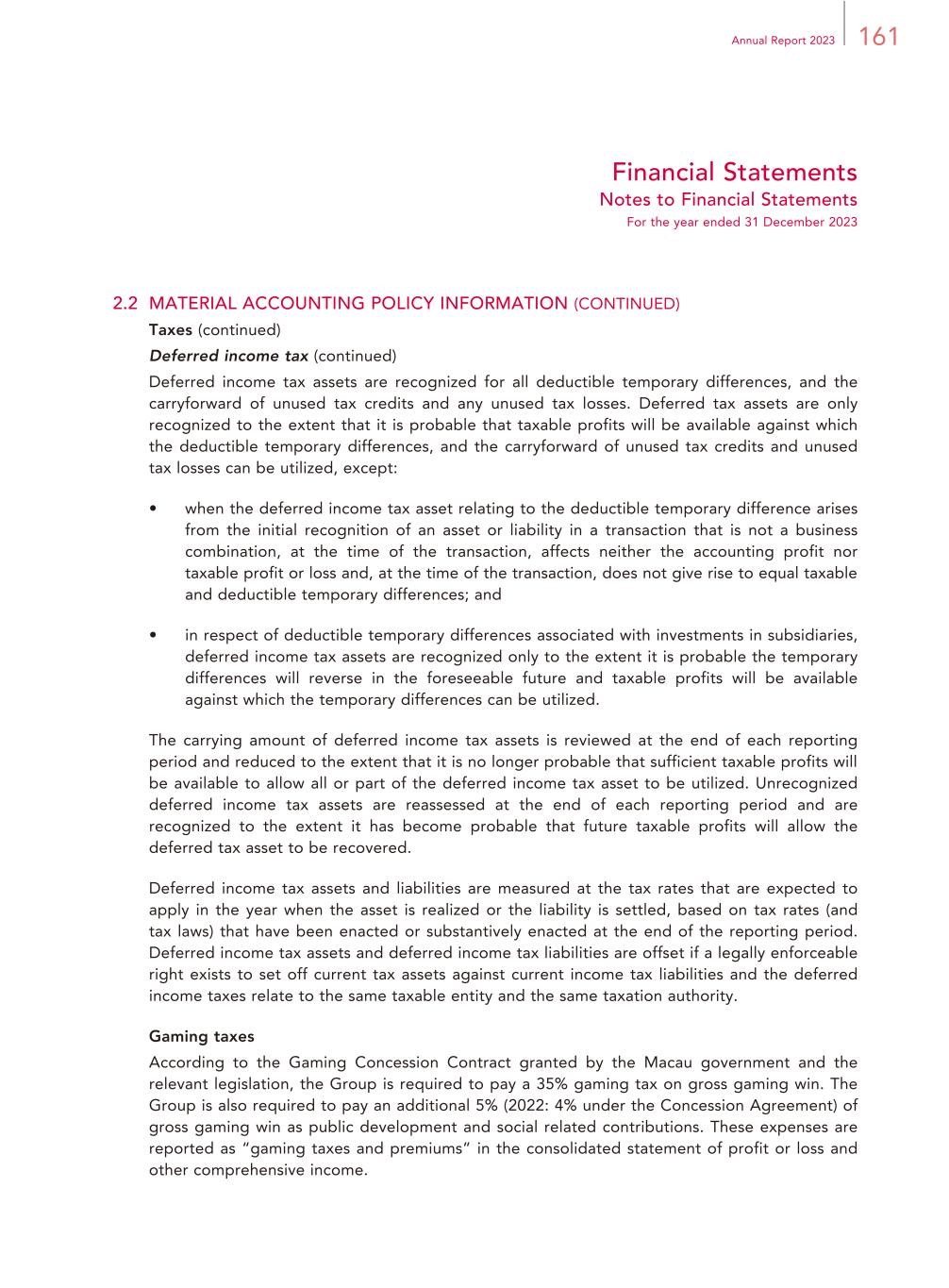 161Annual Report 2023 Financial Statements Notes to Financial Statements For the year ended 31 December 2023 2.2 MATERIAL ACCOUNTING POLICY INFORMATION (CONTINUED) Taxes (continued) Deferred income tax (continued) Deferred income tax assets are recognized for all deductible temporary differences, and the carryforward of unused tax credits and any unused tax losses. Deferred tax assets are only recognized to the extent that it is probable that taxable profits will be available against which the deductible temporary differences, and the carryforward of unused tax credits and unused tax losses can be utilized, except: • when the deferred income tax asset relating to the deductible temporary difference arises from the initial recognition of an asset or liability in a transaction that is not a business combination, at the time of the transaction, affects neither the accounting profit nor taxable profit or loss and, at the time of the transaction, does not give rise to equal taxable and deductible temporary differences; and • in respect of deductible temporary differences associated with investments in subsidiaries, deferred income tax assets are recognized only to the extent it is probable the temporary differences will reverse in the foreseeable future and taxable profits will be available against which the temporary differences can be utilized. The carrying amount of deferred income tax assets is reviewed at the end of each reporting period and reduced to the extent that it is no longer probable that sufficient taxable profits will be available to allow all or part of the deferred income tax asset to be utilized. Unrecognized deferred income tax assets are reassessed at the end of each reporting period and are recognized to the extent it has become probable that future taxable profits will allow the deferred tax asset to be recovered. Deferred income tax assets and liabilities are measured at the tax rates that are expected to apply in the year when the asset is realized or the liability is settled, based on tax rates (and tax laws) that have been enacted or substantively enacted at the end of the reporting period. Deferred income tax assets and deferred income tax liabilities are offset if a legally enforceable right exists to set off current tax assets against current income tax liabilities and the deferred income taxes relate to the same taxable entity and the same taxation authority. Gaming taxes According to the Gaming Concession Contract granted by the Macau government and the relevant legislation, the Group is required to pay a 35% gaming tax on gross gaming win. The Group is also required to pay an additional 5% (2022: 4% under the Concession Agreement) of gross gaming win as public development and social related contributions. These expenses are reported as “gaming taxes and premiums” in the consolidated statement of profit or loss and other comprehensive income.