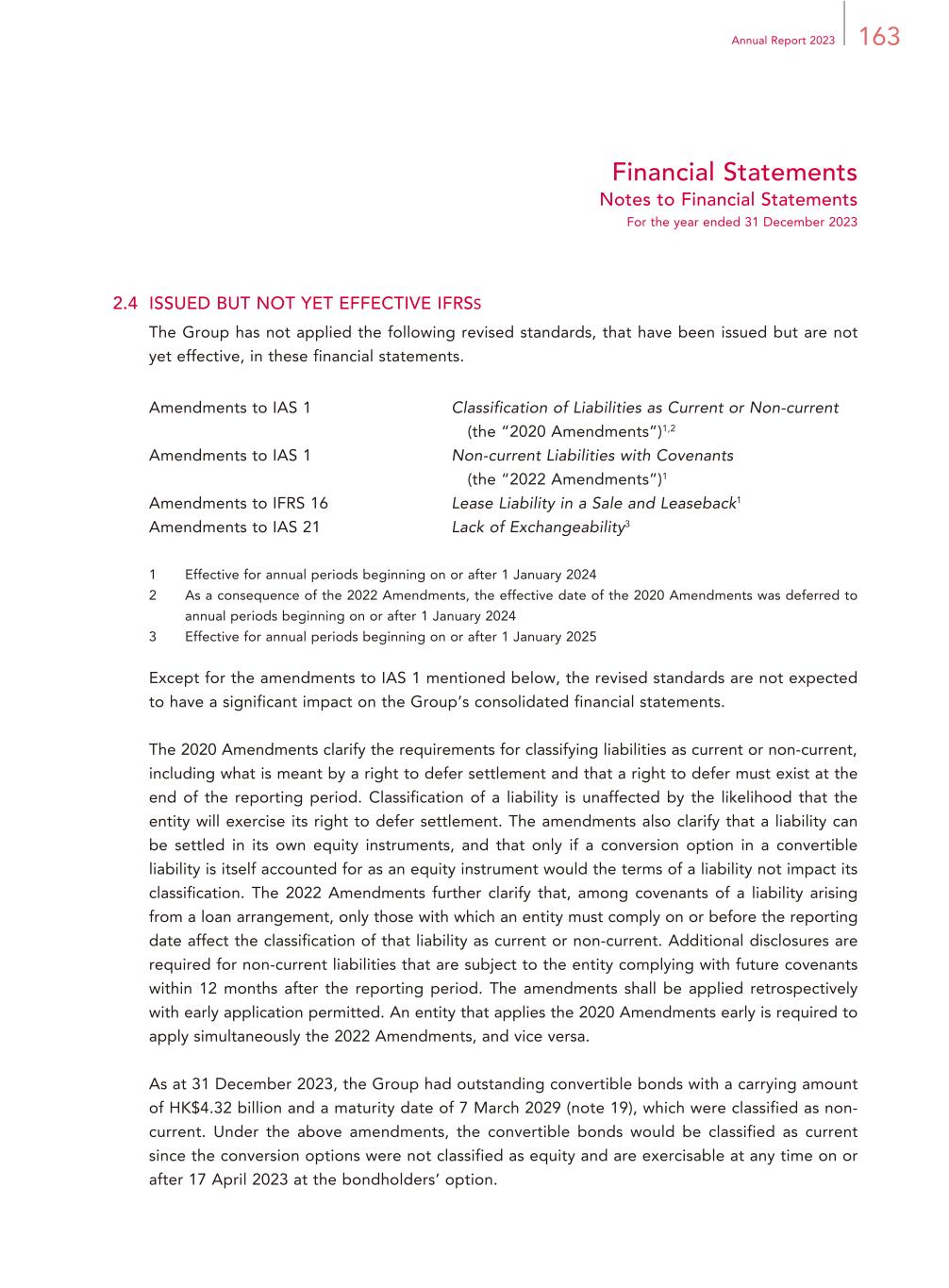 163Annual Report 2023 Financial Statements Notes to Financial Statements For the year ended 31 December 2023 2.4 ISSUED BUT NOT YET EFFECTIVE IFRSS The Group has not applied the following revised standards, that have been issued but are not yet effective, in these financial statements. Amendments to IAS 1 Classification of Liabilities as Current or Non-current (the “2020 Amendments”)1,2 Amendments to IAS 1 Non-current Liabilities with Covenants (the “2022 Amendments”)1 Amendments to IFRS 16 Lease Liability in a Sale and Leaseback1 Amendments to IAS 21 Lack of Exchangeability3 1 Effective for annual periods beginning on or after 1 January 2024 2 As a consequence of the 2022 Amendments, the effective date of the 2020 Amendments was deferred to annual periods beginning on or after 1 January 2024 3 Effective for annual periods beginning on or after 1 January 2025 Except for the amendments to IAS 1 mentioned below, the revised standards are not expected to have a significant impact on the Group’s consolidated financial statements. The 2020 Amendments clarify the requirements for classifying liabilities as current or non-current, including what is meant by a right to defer settlement and that a right to defer must exist at the end of the reporting period. Classification of a liability is unaffected by the likelihood that the entity will exercise its right to defer settlement. The amendments also clarify that a liability can be settled in its own equity instruments, and that only if a conversion option in a convertible liability is itself accounted for as an equity instrument would the terms of a liability not impact its classification. The 2022 Amendments further clarify that, among covenants of a liability arising from a loan arrangement, only those with which an entity must comply on or before the reporting date affect the classification of that liability as current or non-current. Additional disclosures are required for non-current liabilities that are subject to the entity complying with future covenants within 12 months after the reporting period. The amendments shall be applied retrospectively with early application permitted. An entity that applies the 2020 Amendments early is required to apply simultaneously the 2022 Amendments, and vice versa. As at 31 December 2023, the Group had outstanding convertible bonds with a carrying amount of HK$4.32 billion and a maturity date of 7 March 2029 (note 19), which were classified as non- current. Under the above amendments, the convertible bonds would be classified as current since the conversion options were not classified as equity and are exercisable at any time on or after 17 April 2023 at the bondholders’ option.