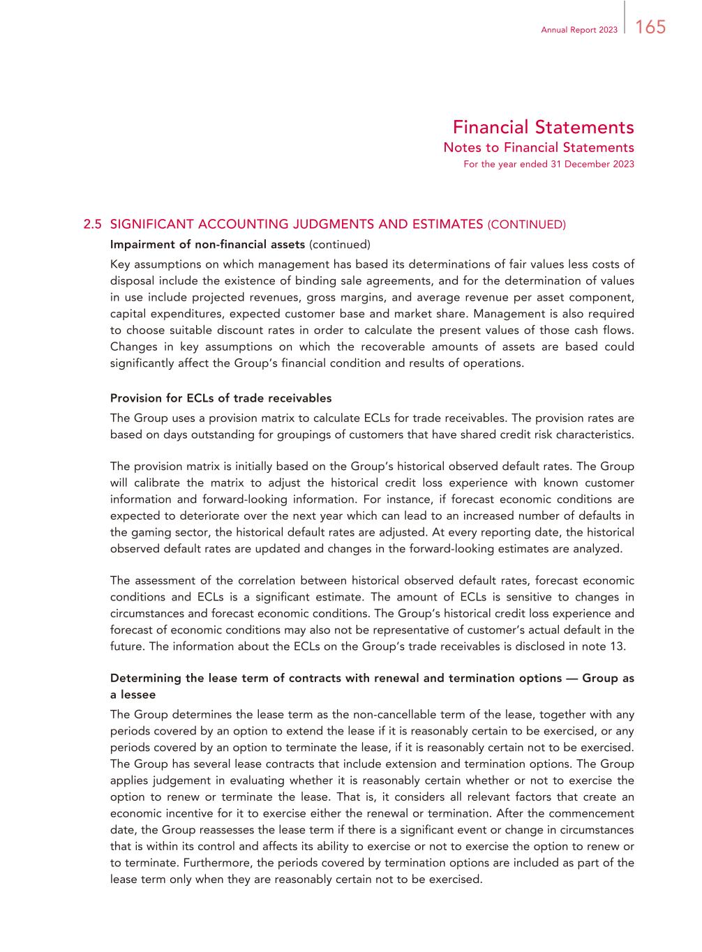 165Annual Report 2023 Financial Statements Notes to Financial Statements For the year ended 31 December 2023 2.5 SIGNIFICANT ACCOUNTING JUDGMENTS AND ESTIMATES (CONTINUED) Impairment of non-financial assets (continued) Key assumptions on which management has based its determinations of fair values less costs of disposal include the existence of binding sale agreements, and for the determination of values in use include projected revenues, gross margins, and average revenue per asset component, capital expenditures, expected customer base and market share. Management is also required to choose suitable discount rates in order to calculate the present values of those cash flows. Changes in key assumptions on which the recoverable amounts of assets are based could significantly affect the Group’s financial condition and results of operations. Provision for ECLs of trade receivables The Group uses a provision matrix to calculate ECLs for trade receivables. The provision rates are based on days outstanding for groupings of customers that have shared credit risk characteristics. The provision matrix is initially based on the Group’s historical observed default rates. The Group will calibrate the matrix to adjust the historical credit loss experience with known customer information and forward-looking information. For instance, if forecast economic conditions are expected to deteriorate over the next year which can lead to an increased number of defaults in the gaming sector, the historical default rates are adjusted. At every reporting date, the historical observed default rates are updated and changes in the forward-looking estimates are analyzed. The assessment of the correlation between historical observed default rates, forecast economic conditions and ECLs is a significant estimate. The amount of ECLs is sensitive to changes in circumstances and forecast economic conditions. The Group’s historical credit loss experience and forecast of economic conditions may also not be representative of customer’s actual default in the future. The information about the ECLs on the Group’s trade receivables is disclosed in note 13. Determining the lease term of contracts with renewal and termination options — Group as a lessee The Group determines the lease term as the non-cancellable term of the lease, together with any periods covered by an option to extend the lease if it is reasonably certain to be exercised, or any periods covered by an option to terminate the lease, if it is reasonably certain not to be exercised. The Group has several lease contracts that include extension and termination options. The Group applies judgement in evaluating whether it is reasonably certain whether or not to exercise the option to renew or terminate the lease. That is, it considers all relevant factors that create an economic incentive for it to exercise either the renewal or termination. After the commencement date, the Group reassesses the lease term if there is a significant event or change in circumstances that is within its control and affects its ability to exercise or not to exercise the option to renew or to terminate. Furthermore, the periods covered by termination options are included as part of the lease term only when they are reasonably certain not to be exercised.