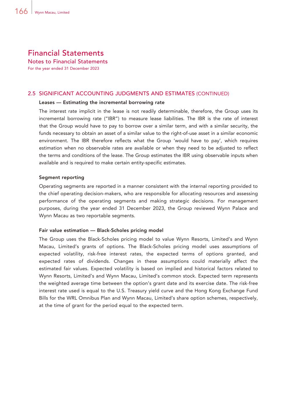 166 Wynn Macau, Limited Financial Statements Notes to Financial Statements For the year ended 31 December 2023 2.5 SIGNIFICANT ACCOUNTING JUDGMENTS AND ESTIMATES (CONTINUED) Leases — Estimating the incremental borrowing rate The interest rate implicit in the lease is not readily determinable, therefore, the Group uses its incremental borrowing rate (“IBR”) to measure lease liabilities. The IBR is the rate of interest that the Group would have to pay to borrow over a similar term, and with a similar security, the funds necessary to obtain an asset of a similar value to the right-of-use asset in a similar economic environment. The IBR therefore reflects what the Group ‘would have to pay’, which requires estimation when no observable rates are available or when they need to be adjusted to reflect the terms and conditions of the lease. The Group estimates the IBR using observable inputs when available and is required to make certain entity-specific estimates. Segment reporting Operating segments are reported in a manner consistent with the internal reporting provided to the chief operating decision-makers, who are responsible for allocating resources and assessing performance of the operating segments and making strategic decisions. For management purposes, during the year ended 31 December 2023, the Group reviewed Wynn Palace and Wynn Macau as two reportable segments. Fair value estimation — Black-Scholes pricing model The Group uses the Black-Scholes pricing model to value Wynn Resorts, Limited’s and Wynn Macau, Limited’s grants of options. The Black-Scholes pricing model uses assumptions of expected volatility, risk-free interest rates, the expected terms of options granted, and expected rates of dividends. Changes in these assumptions could materially affect the estimated fair values. Expected volatility is based on implied and historical factors related to Wynn Resorts, Limited’s and Wynn Macau, Limited’s common stock. Expected term represents the weighted average time between the option’s grant date and its exercise date. The risk-free interest rate used is equal to the U.S. Treasury yield curve and the Hong Kong Exchange Fund Bills for the WRL Omnibus Plan and Wynn Macau, Limited’s share option schemes, respectively, at the time of grant for the period equal to the expected term.