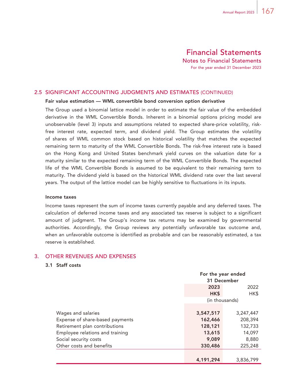 167Annual Report 2023 Financial Statements Notes to Financial Statements For the year ended 31 December 2023 2.5 SIGNIFICANT ACCOUNTING JUDGMENTS AND ESTIMATES (CONTINUED) Fair value estimation — WML convertible bond conversion option derivative The Group used a binomial lattice model in order to estimate the fair value of the embedded derivative in the WML Convertible Bonds. Inherent in a binomial options pricing model are unobservable (level 3) inputs and assumptions related to expected share-price volatility, risk- free interest rate, expected term, and dividend yield. The Group estimates the volatility of shares of WML common stock based on historical volatility that matches the expected remaining term to maturity of the WML Convertible Bonds. The risk-free interest rate is based on the Hong Kong and United States benchmark yield curves on the valuation date for a maturity similar to the expected remaining term of the WML Convertible Bonds. The expected life of the WML Convertible Bonds is assumed to be equivalent to their remaining term to maturity. The dividend yield is based on the historical WML dividend rate over the last several years. The output of the lattice model can be highly sensitive to fluctuations in its inputs. Income taxes Income taxes represent the sum of income taxes currently payable and any deferred taxes. The calculation of deferred income taxes and any associated tax reserve is subject to a significant amount of judgment. The Group’s income tax returns may be examined by governmental authorities. Accordingly, the Group reviews any potentially unfavorable tax outcome and, when an unfavorable outcome is identified as probable and can be reasonably estimated, a tax reserve is established. 3. OTHER REVENUES AND EXPENSES 3.1 Staff costs For the year ended 31 December 2023 2022 HK$ HK$ (in thousands) Wages and salaries 3,547,517 3,247,447 Expense of share-based payments 162,466 208,394 Retirement plan contributions 128,121 132,733 Employee relations and training 13,615 14,097 Social security costs 9,089 8,880 Other costs and benefits 330,486 225,248 4,191,294 3,836,799