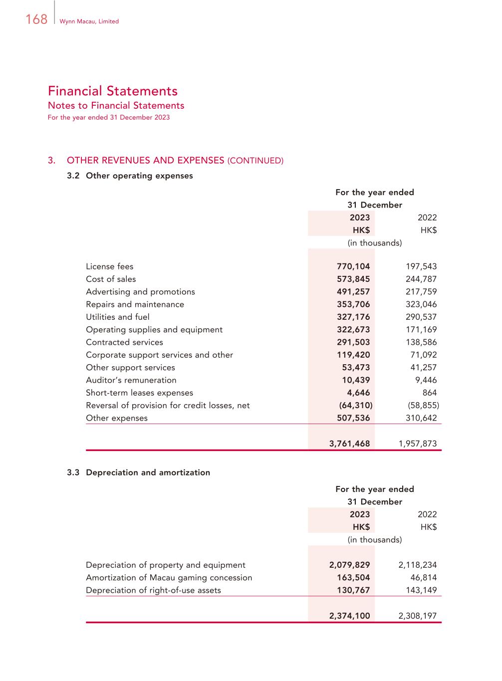 168 Wynn Macau, Limited Financial Statements Notes to Financial Statements For the year ended 31 December 2023 3. OTHER REVENUES AND EXPENSES (CONTINUED) 3.2 Other operating expenses For the year ended 31 December 2023 2022 HK$ HK$ (in thousands) License fees 770,104 197,543 Cost of sales 573,845 244,787 Advertising and promotions 491,257 217,759 Repairs and maintenance 353,706 323,046 Utilities and fuel 327,176 290,537 Operating supplies and equipment 322,673 171,169 Contracted services 291,503 138,586 Corporate support services and other 119,420 71,092 Other support services 53,473 41,257 Auditor’s remuneration 10,439 9,446 Short-term leases expenses 4,646 864 Reversal of provision for credit losses, net (64,310) (58,855) Other expenses 507,536 310,642 3,761,468 1,957,873 3.3 Depreciation and amortization For the year ended 31 December 2023 2022 HK$ HK$ (in thousands) Depreciation of property and equipment 2,079,829 2,118,234 Amortization of Macau gaming concession 163,504 46,814 Depreciation of right-of-use assets 130,767 143,149 2,374,100 2,308,197