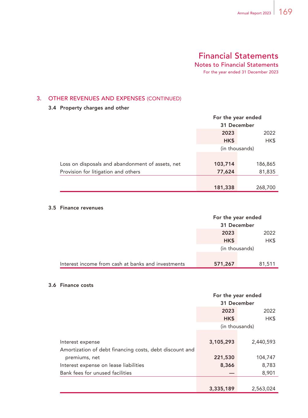 169Annual Report 2023 Financial Statements Notes to Financial Statements For the year ended 31 December 2023 3. OTHER REVENUES AND EXPENSES (CONTINUED) 3.4 Property charges and other For the year ended 31 December 2023 2022 HK$ HK$ (in thousands) Loss on disposals and abandonment of assets, net 103,714 186,865 Provision for litigation and others 77,624 81,835 181,338 268,700 3.5 Finance revenues For the year ended 31 December 2023 2022 HK$ HK$ (in thousands) Interest income from cash at banks and investments 571,267 81,511 3.6 Finance costs For the year ended 31 December 2023 2022 HK$ HK$ (in thousands) Interest expense 3,105,293 2,440,593 Amortization of debt financing costs, debt discount and premiums, net 221,530 104,747 Interest expense on lease liabilities 8,366 8,783 Bank fees for unused facilities — 8,901 3,335,189 2,563,024
