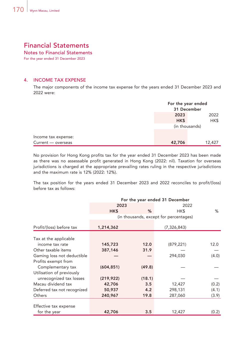 170 Wynn Macau, Limited Financial Statements Notes to Financial Statements For the year ended 31 December 2023 4. INCOME TAX EXPENSE The major components of the income tax expense for the years ended 31 December 2023 and 2022 were: For the year ended 31 December 2023 2022 HK$ HK$ (in thousands) Income tax expense: Current — overseas 42,706 12,427 No provision for Hong Kong profits tax for the year ended 31 December 2023 has been made as there was no assessable profit generated in Hong Kong (2022: nil). Taxation for overseas jurisdictions is charged at the appropriate prevailing rates ruling in the respective jurisdictions and the maximum rate is 12% (2022: 12%). The tax position for the years ended 31 December 2023 and 2022 reconciles to profit/(loss) before tax as follows: For the year ended 31 December 2023 2022 HK$ % HK$ % (in thousands, except for percentages) Profit/(loss) before tax 1,214,362 (7,326,843) Tax at the applicable income tax rate 145,723 12.0 (879,221) 12.0 Other taxable items 387,146 31.9 — — Gaming loss not deductible — — 294,030 (4.0) Profits exempt from Complementary tax (604,851) (49.8) — — Utilisation of previously unrecognized tax losses (219,922) (18.1) — — Macau dividend tax 42,706 3.5 12,427 (0.2) Deferred tax not recognized 50,937 4.2 298,131 (4.1) Others 240,967 19.8 287,060 (3.9) Effective tax expense for the year 42,706 3.5 12,427 (0.2)