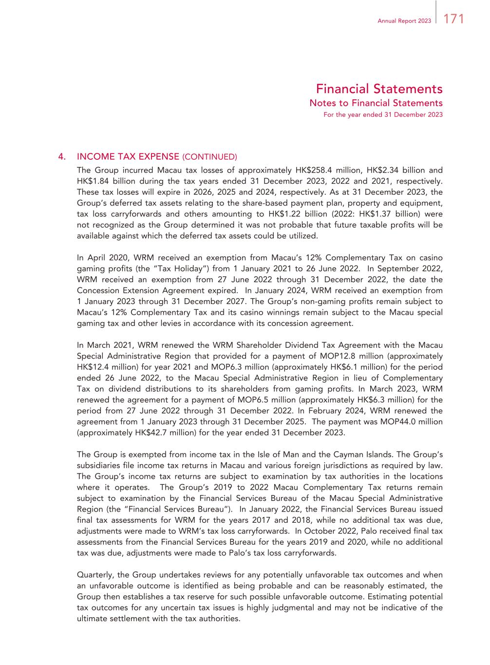 171Annual Report 2023 Financial Statements Notes to Financial Statements For the year ended 31 December 2023 4. INCOME TAX EXPENSE (CONTINUED) The Group incurred Macau tax losses of approximately HK$258.4 million, HK$2.34 billion and HK$1.84 billion during the tax years ended 31 December 2023, 2022 and 2021, respectively. These tax losses will expire in 2026, 2025 and 2024, respectively. As at 31 December 2023, the Group’s deferred tax assets relating to the share-based payment plan, property and equipment, tax loss carryforwards and others amounting to HK$1.22 billion (2022: HK$1.37 billion) were not recognized as the Group determined it was not probable that future taxable profits will be available against which the deferred tax assets could be utilized. In April 2020, WRM received an exemption from Macau’s 12% Complementary Tax on casino gaming profits (the “Tax Holiday”) from 1 January 2021 to 26 June 2022. In September 2022, WRM received an exemption from 27 June 2022 through 31 December 2022, the date the Concession Extension Agreement expired. In January 2024, WRM received an exemption from 1 January 2023 through 31 December 2027. The Group’s non-gaming profits remain subject to Macau’s 12% Complementary Tax and its casino winnings remain subject to the Macau special gaming tax and other levies in accordance with its concession agreement. In March 2021, WRM renewed the WRM Shareholder Dividend Tax Agreement with the Macau Special Administrative Region that provided for a payment of MOP12.8 million (approximately HK$12.4 million) for year 2021 and MOP6.3 million (approximately HK$6.1 million) for the period ended 26 June 2022, to the Macau Special Administrative Region in lieu of Complementary Tax on dividend distributions to its shareholders from gaming profits. In March 2023, WRM renewed the agreement for a payment of MOP6.5 million (approximately HK$6.3 million) for the period from 27 June 2022 through 31 December 2022. In February 2024, WRM renewed the agreement from 1 January 2023 through 31 December 2025. The payment was MOP44.0 million (approximately HK$42.7 million) for the year ended 31 December 2023. The Group is exempted from income tax in the Isle of Man and the Cayman Islands. The Group’s subsidiaries file income tax returns in Macau and various foreign jurisdictions as required by law. The Group’s income tax returns are subject to examination by tax authorities in the locations where it operates. The Group’s 2019 to 2022 Macau Complementary Tax returns remain subject to examination by the Financial Services Bureau of the Macau Special Administrative Region (the “Financial Services Bureau”). In January 2022, the Financial Services Bureau issued final tax assessments for WRM for the years 2017 and 2018, while no additional tax was due, adjustments were made to WRM’s tax loss carryforwards. In October 2022, Palo received final tax assessments from the Financial Services Bureau for the years 2019 and 2020, while no additional tax was due, adjustments were made to Palo’s tax loss carryforwards. Quarterly, the Group undertakes reviews for any potentially unfavorable tax outcomes and when an unfavorable outcome is identified as being probable and can be reasonably estimated, the Group then establishes a tax reserve for such possible unfavorable outcome. Estimating potential tax outcomes for any uncertain tax issues is highly judgmental and may not be indicative of the ultimate settlement with the tax authorities.