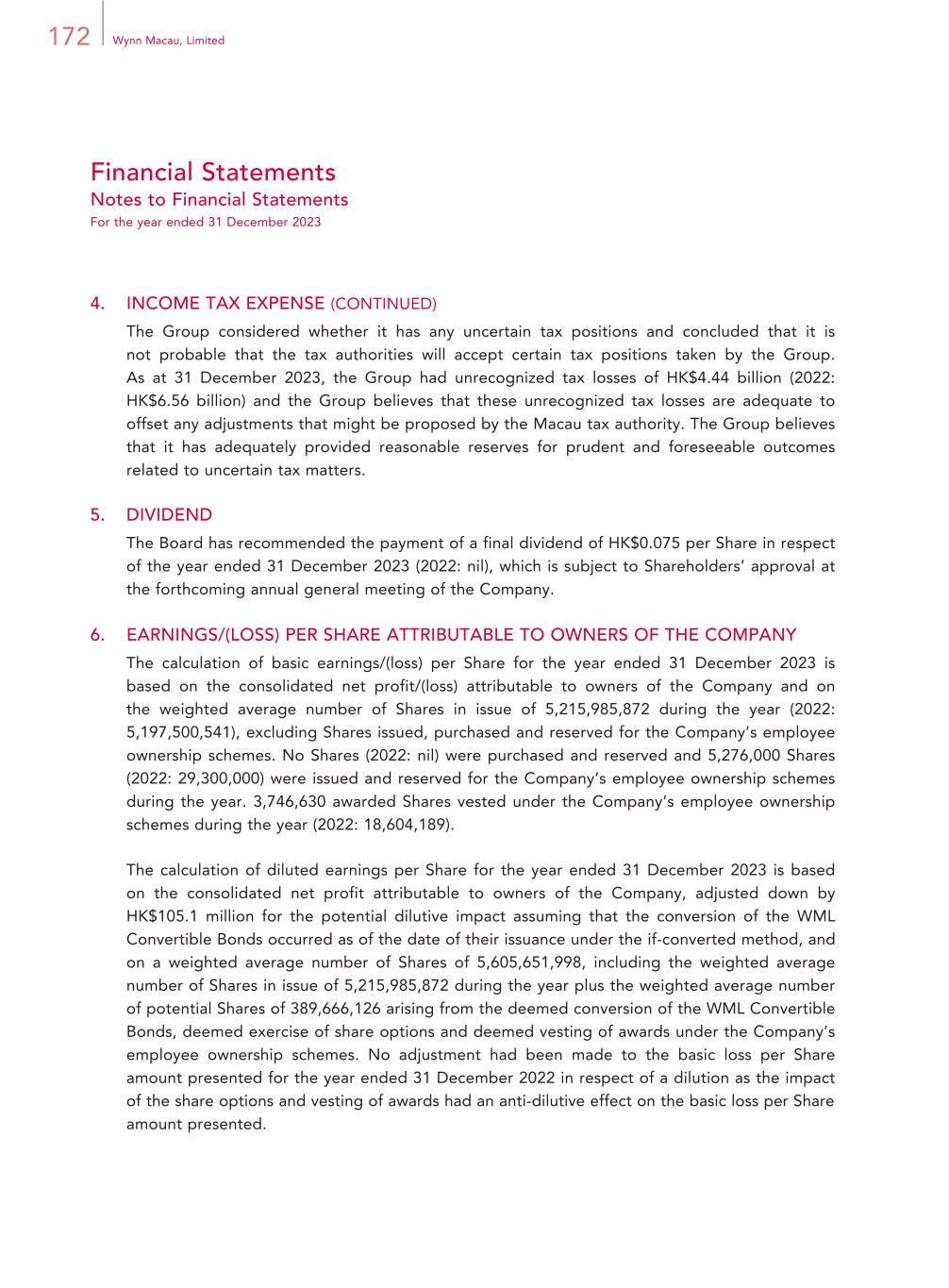 172 Wynn Macau, Limited Financial Statements Notes to Financial Statements For the year ended 31 December 2023 4. INCOME TAX EXPENSE (CONTINUED) The Group considered whether it has any uncertain tax positions and concluded that it is not probable that the tax authorities will accept certain tax positions taken by the Group. As at 31 December 2023, the Group had unrecognized tax losses of HK$4.44 billion (2022: HK$6.56 billion) and the Group believes that these unrecognized tax losses are adequate to offset any adjustments that might be proposed by the Macau tax authority. The Group believes that it has adequately provided reasonable reserves for prudent and foreseeable outcomes related to uncertain tax matters. 5. DIVIDEND The Board has recommended the payment of a final dividend of HK$0.075 per Share in respect of the year ended 31 December 2023 (2022: nil), which is subject to Shareholders’ approval at the forthcoming annual general meeting of the Company. 6. EARNINGS/(LOSS) PER SHARE ATTRIBUTABLE TO OWNERS OF THE COMPANY The calculation of basic earnings/(loss) per Share for the year ended 31 December 2023 is based on the consolidated net profit/(loss) attributable to owners of the Company and on the weighted average number of Shares in issue of 5,215,985,872 during the year (2022: 5,197,500,541), excluding Shares issued, purchased and reserved for the Company’s employee ownership schemes. No Shares (2022: nil) were purchased and reserved and 5,276,000 Shares (2022: 29,300,000) were issued and reserved for the Company’s employee ownership schemes during the year. 3,746,630 awarded Shares vested under the Company’s employee ownership schemes during the year (2022: 18,604,189). The calculation of diluted earnings per Share for the year ended 31 December 2023 is based on the consolidated net profit attributable to owners of the Company, adjusted down by HK$105.1 million for the potential dilutive impact assuming that the conversion of the WML Convertible Bonds occurred as of the date of their issuance under the if-converted method, and on a weighted average number of Shares of 5,605,651,998, including the weighted average number of Shares in issue of 5,215,985,872 during the year plus the weighted average number of potential Shares of 389,666,126 arising from the deemed conversion of the WML Convertible Bonds, deemed exercise of share options and deemed vesting of awards under the Company’s employee ownership schemes. No adjustment had been made to the basic loss per Share amount presented for the year ended 31 December 2022 in respect of a dilution as the impact of the share options and vesting of awards had an anti-dilutive effect on the basic loss per Share amount presented.