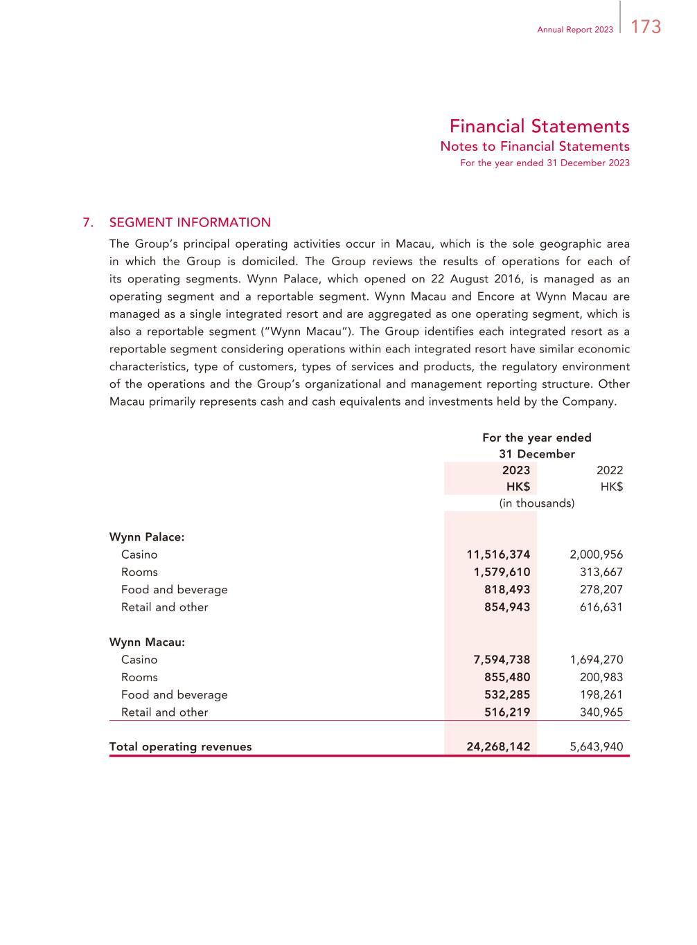 173Annual Report 2023 Financial Statements Notes to Financial Statements For the year ended 31 December 2023 7. SEGMENT INFORMATION The Group’s principal operating activities occur in Macau, which is the sole geographic area in which the Group is domiciled. The Group reviews the results of operations for each of its operating segments. Wynn Palace, which opened on 22 August 2016, is managed as an operating segment and a reportable segment. Wynn Macau and Encore at Wynn Macau are managed as a single integrated resort and are aggregated as one operating segment, which is also a reportable segment (“Wynn Macau”). The Group identifies each integrated resort as a reportable segment considering operations within each integrated resort have similar economic characteristics, type of customers, types of services and products, the regulatory environment of the operations and the Group’s organizational and management reporting structure. Other Macau primarily represents cash and cash equivalents and investments held by the Company. For the year ended 31 December 2023 2022 HK$ HK$ (in thousands) Wynn Palace: Casino 11,516,374 2,000,956 Rooms 1,579,610 313,667 Food and beverage 818,493 278,207 Retail and other 854,943 616,631 Wynn Macau: Casino 7,594,738 1,694,270 Rooms 855,480 200,983 Food and beverage 532,285 198,261 Retail and other 516,219 340,965 Total operating revenues 24,268,142 5,643,940