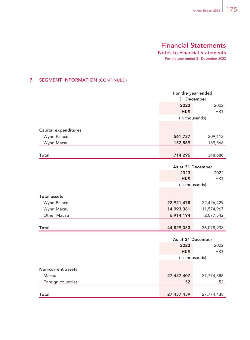 175Annual Report 2023 Financial Statements Notes to Financial Statements For the year ended 31 December 2023 7. SEGMENT INFORMATION (CONTINUED) For the year ended 31 December 2023 2022 HK$ HK$ (in thousands) Capital expenditures Wynn Palace 561,727 209,112 Wynn Macau 152,569 139,568 Total 714,296 348,680 As at 31 December 2023 2022 HK$ HK$ (in thousands) Total assets Wynn Palace 22,921,478 22,426,429 Wynn Macau 14,993,381 11,574,967 Other Macau 6,914,194 2,077,542 Total 44,829,053 36,078,938 As at 31 December 2023 2022 HK$ HK$ (in thousands) Non-current assets Macau 27,457,407 27,774,386 Foreign countries 52 52 Total 27,457,459 27,774,438