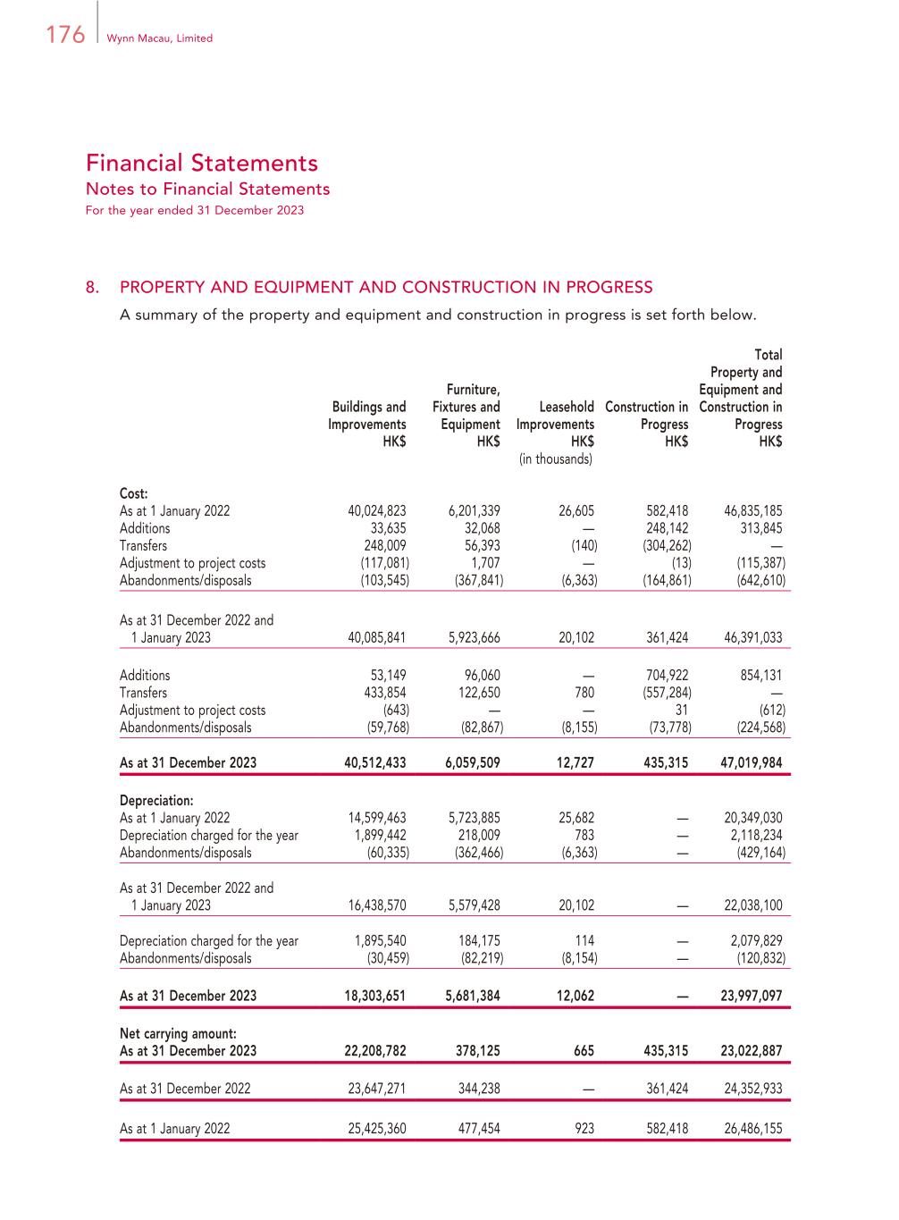 176 Wynn Macau, Limited Financial Statements Notes to Financial Statements For the year ended 31 December 2023 8. PROPERTY AND EQUIPMENT AND CONSTRUCTION IN PROGRESS A summary of the property and equipment and construction in progress is set forth below. Buildings and Improvements Furniture, Fixtures and Equipment Leasehold Improvements Construction in Progress Total Property and Equipment and Construction in Progress HK$ HK$ HK$ HK$ HK$ (in thousands) Cost: As at 1 January 2022 40,024,823 6,201,339 26,605 582,418 46,835,185 Additions 33,635 32,068 — 248,142 313,845 Transfers 248,009 56,393 (140) (304,262) — Adjustment to project costs (117,081) 1,707 — (13) (115,387) Abandonments/disposals (103,545) (367,841) (6,363) (164,861) (642,610) As at 31 December 2022 and 1 January 2023 40,085,841 5,923,666 20,102 361,424 46,391,033 Additions 53,149 96,060 — 704,922 854,131 Transfers 433,854 122,650 780 (557,284) — Adjustment to project costs (643) — — 31 (612) Abandonments/disposals (59,768) (82,867) (8,155) (73,778) (224,568) As at 31 December 2023 40,512,433 6,059,509 12,727 435,315 47,019,984 Depreciation: As at 1 January 2022 14,599,463 5,723,885 25,682 — 20,349,030 Depreciation charged for the year 1,899,442 218,009 783 — 2,118,234 Abandonments/disposals (60,335) (362,466) (6,363) — (429,164) As at 31 December 2022 and 1 January 2023 16,438,570 5,579,428 20,102 — 22,038,100 Depreciation charged for the year 1,895,540 184,175 114 — 2,079,829 Abandonments/disposals (30,459) (82,219) (8,154) — (120,832) As at 31 December 2023 18,303,651 5,681,384 12,062 — 23,997,097 Net carrying amount: As at 31 December 2023 22,208,782 378,125 665 435,315 23,022,887 As at 31 December 2022 23,647,271 344,238 — 361,424 24,352,933 As at 1 January 2022 25,425,360 477,454 923 582,418 26,486,155