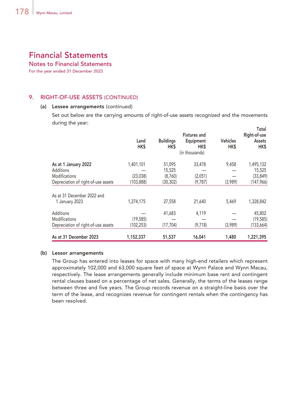 178 Wynn Macau, Limited Financial Statements Notes to Financial Statements For the year ended 31 December 2023 9. RIGHT-OF-USE ASSETS (CONTINUED) (a) Lessee arrangements (continued) Set out below are the carrying amounts of right-of-use assets recognized and the movements during the year: Land Buildings Fixtures and Equipment Vehicles Total Right-of-use Assets HK$ HK$ HK$ HK$ HK$ (in thousands) As at 1 January 2022 1,401,101 51,095 33,478 9,458 1,495,132 Additions — 15,525 — — 15,525 Modifications (23,038) (8,760) (2,051) — (33,849) Depreciation of right-of-use assets (103,888) (30,302) (9,787) (3,989) (147,966) As at 31 December 2022 and 1 January 2023 1,274,175 27,558 21,640 5,469 1,328,842 Additions — 41,683 4,119 — 45,802 Modifications (19,585) — — — (19,585) Depreciation of right-of-use assets (102,253) (17,704) (9,718) (3,989) (133,664) As at 31 December 2023 1,152,337 51,537 16,041 1,480 1,221,395 (b) Lessor arrangements The Group has entered into leases for space with many high-end retailers which represent approximately 102,000 and 63,000 square feet of space at Wynn Palace and Wynn Macau, respectively. The lease arrangements generally include minimum base rent and contingent rental clauses based on a percentage of net sales. Generally, the terms of the leases range between three and five years. The Group records revenue on a straight-line basis over the term of the lease, and recognizes revenue for contingent rentals when the contingency has been resolved.