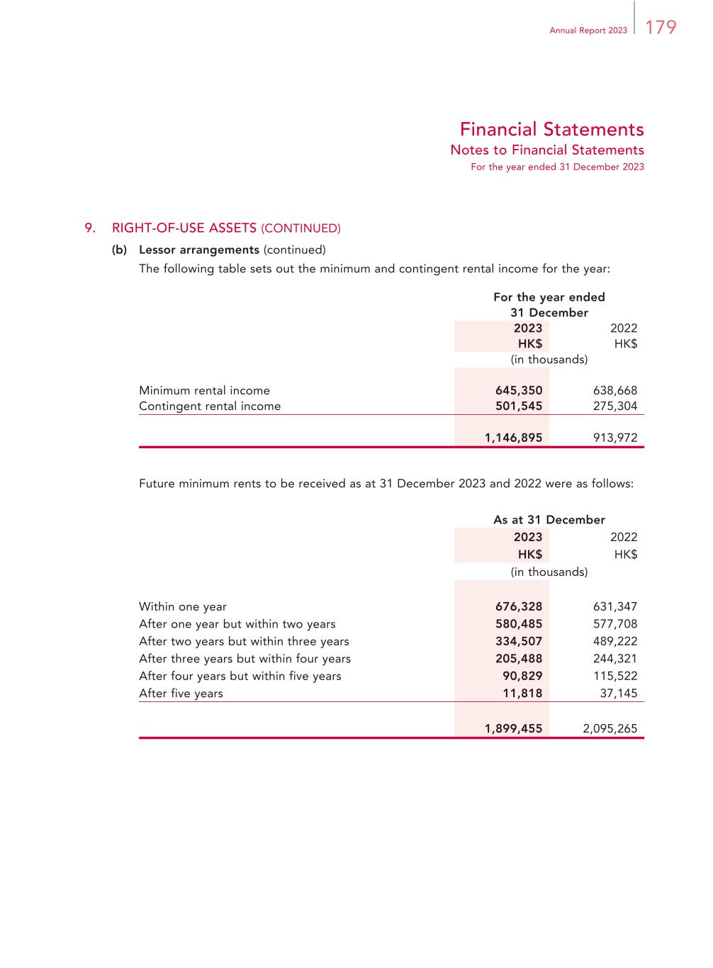 179Annual Report 2023 Financial Statements Notes to Financial Statements For the year ended 31 December 2023 9. RIGHT-OF-USE ASSETS (CONTINUED) (b) Lessor arrangements (continued) The following table sets out the minimum and contingent rental income for the year: For the year ended 31 December 2023 2022 HK$ HK$ (in thousands) Minimum rental income 645,350 638,668 Contingent rental income 501,545 275,304 1,146,895 913,972 Future minimum rents to be received as at 31 December 2023 and 2022 were as follows: As at 31 December 2023 2022 HK$ HK$ (in thousands) Within one year 676,328 631,347 After one year but within two years 580,485 577,708 After two years but within three years 334,507 489,222 After three years but within four years 205,488 244,321 After four years but within five years 90,829 115,522 After five years 11,818 37,145 1,899,455 2,095,265