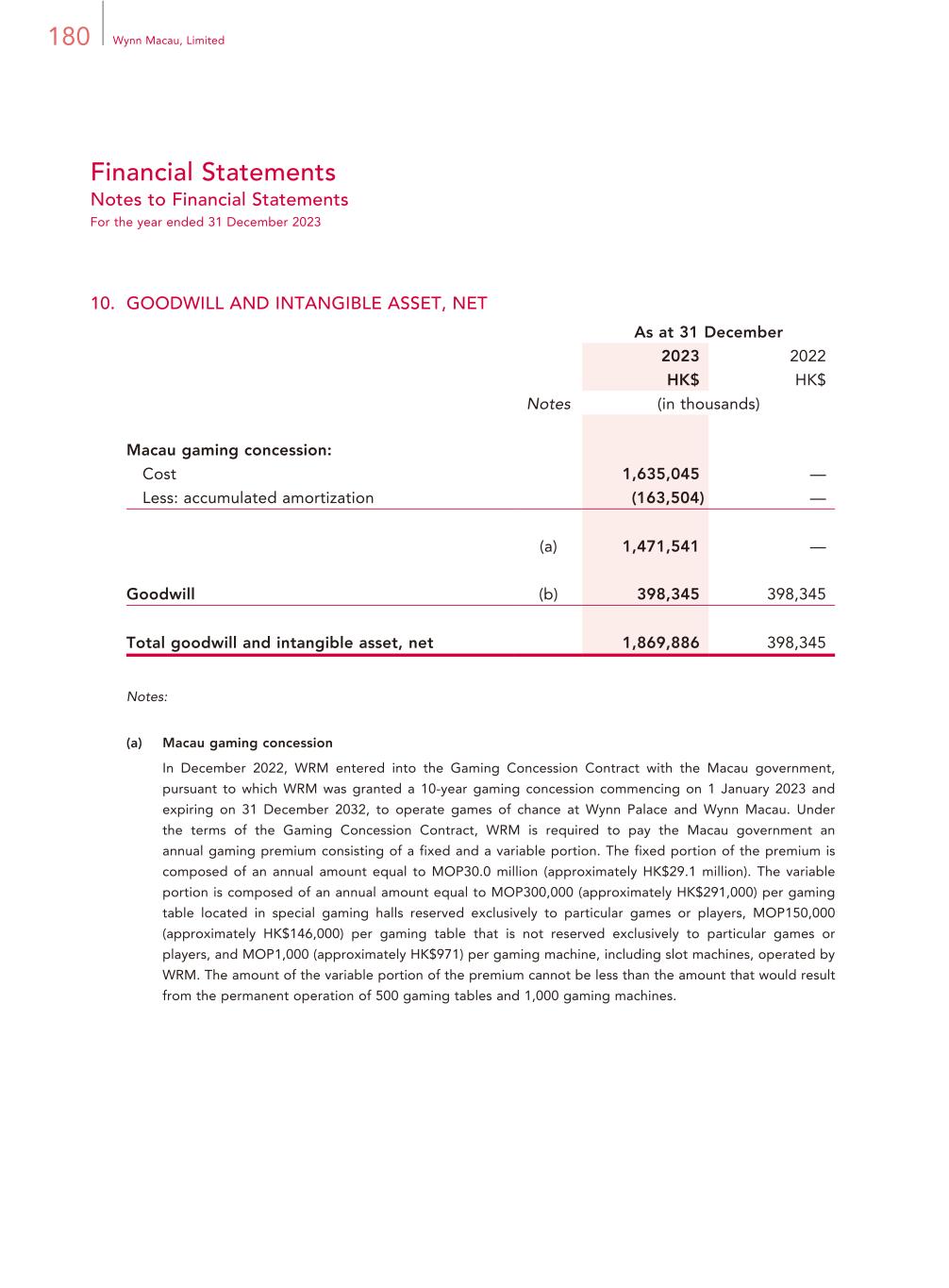 180 Wynn Macau, Limited Financial Statements Notes to Financial Statements For the year ended 31 December 2023 10. GOODWILL AND INTANGIBLE ASSET, NET As at 31 December 2023 2022 HK$ HK$ Notes (in thousands) Macau gaming concession: Cost 1,635,045 — Less: accumulated amortization (163,504) — (a) 1,471,541 — Goodwill (b) 398,345 398,345 Total goodwill and intangible asset, net 1,869,886 398,345 Notes: (a) Macau gaming concession In December 2022, WRM entered into the Gaming Concession Contract with the Macau government, pursuant to which WRM was granted a 10-year gaming concession commencing on 1 January 2023 and expiring on 31 December 2032, to operate games of chance at Wynn Palace and Wynn Macau. Under the terms of the Gaming Concession Contract, WRM is required to pay the Macau government an annual gaming premium consisting of a fixed and a variable portion. The fixed portion of the premium is composed of an annual amount equal to MOP30.0 million (approximately HK$29.1 million). The variable portion is composed of an annual amount equal to MOP300,000 (approximately HK$291,000) per gaming table located in special gaming halls reserved exclusively to particular games or players, MOP150,000 (approximately HK$146,000) per gaming table that is not reserved exclusively to particular games or players, and MOP1,000 (approximately HK$971) per gaming machine, including slot machines, operated by WRM. The amount of the variable portion of the premium cannot be less than the amount that would result from the permanent operation of 500 gaming tables and 1,000 gaming machines.