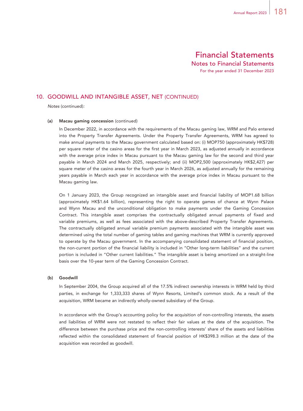 181Annual Report 2023 Financial Statements Notes to Financial Statements For the year ended 31 December 2023 10. GOODWILL AND INTANGIBLE ASSET, NET (CONTINUED) Notes (continued): (a) Macau gaming concession (continued) In December 2022, in accordance with the requirements of the Macau gaming law, WRM and Palo entered into the Property Transfer Agreements. Under the Property Transfer Agreements, WRM has agreed to make annual payments to the Macau government calculated based on: (i) MOP750 (approximately HK$728) per square meter of the casino areas for the first year in March 2023, as adjusted annually in accordance with the average price index in Macau pursuant to the Macau gaming law for the second and third year payable in March 2024 and March 2025, respectively; and (ii) MOP2,500 (approximately HK$2,427) per square meter of the casino areas for the fourth year in March 2026, as adjusted annually for the remaining years payable in March each year in accordance with the average price index in Macau pursuant to the Macau gaming law. On 1 January 2023, the Group recognized an intangible asset and financial liability of MOP1.68 billion (approximately HK$1.64 billion), representing the right to operate games of chance at Wynn Palace and Wynn Macau and the unconditional obligation to make payments under the Gaming Concession Contract. This intangible asset comprises the contractually obligated annual payments of fixed and variable premiums, as well as fees associated with the above-described Property Transfer Agreements. The contractually obligated annual variable premium payments associated with the intangible asset was determined using the total number of gaming tables and gaming machines that WRM is currently approved to operate by the Macau government. In the accompanying consolidated statement of financial position, the non-current portion of the financial liability is included in “Other long-term liabilities” and the current portion is included in “Other current liabilities.” The intangible asset is being amortized on a straight-line basis over the 10-year term of the Gaming Concession Contract. (b) Goodwill In September 2004, the Group acquired all of the 17.5% indirect ownership interests in WRM held by third parties, in exchange for 1,333,333 shares of Wynn Resorts, Limited’s common stock. As a result of the acquisition, WRM became an indirectly wholly-owned subsidiary of the Group. In accordance with the Group’s accounting policy for the acquisition of non-controlling interests, the assets and liabilities of WRM were not restated to reflect their fair values at the date of the acquisition. The difference between the purchase price and the non-controlling interests’ share of the assets and liabilities reflected within the consolidated statement of financial position of HK$398.3 million at the date of the acquisition was recorded as goodwill.