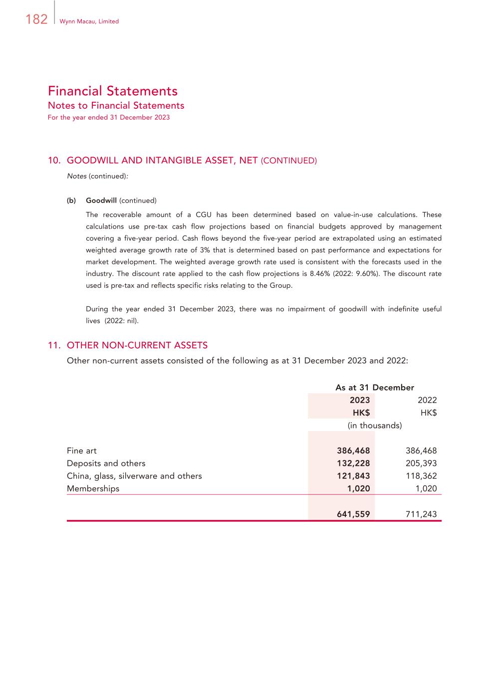182 Wynn Macau, Limited Financial Statements Notes to Financial Statements For the year ended 31 December 2023 10. GOODWILL AND INTANGIBLE ASSET, NET (CONTINUED) Notes (continued): (b) Goodwill (continued) The recoverable amount of a CGU has been determined based on value-in-use calculations. These calculations use pre-tax cash flow projections based on financial budgets approved by management covering a five-year period. Cash flows beyond the five-year period are extrapolated using an estimated weighted average growth rate of 3% that is determined based on past performance and expectations for market development. The weighted average growth rate used is consistent with the forecasts used in the industry. The discount rate applied to the cash flow projections is 8.46% (2022: 9.60%). The discount rate used is pre-tax and reflects specific risks relating to the Group. During the year ended 31 December 2023, there was no impairment of goodwill with indefinite useful lives (2022: nil). 11. OTHER NON-CURRENT ASSETS Other non-current assets consisted of the following as at 31 December 2023 and 2022: As at 31 December 2023 2022 HK$ HK$ (in thousands) Fine art 386,468 386,468 Deposits and others 132,228 205,393 China, glass, silverware and others 121,843 118,362 Memberships 1,020 1,020 641,559 711,243