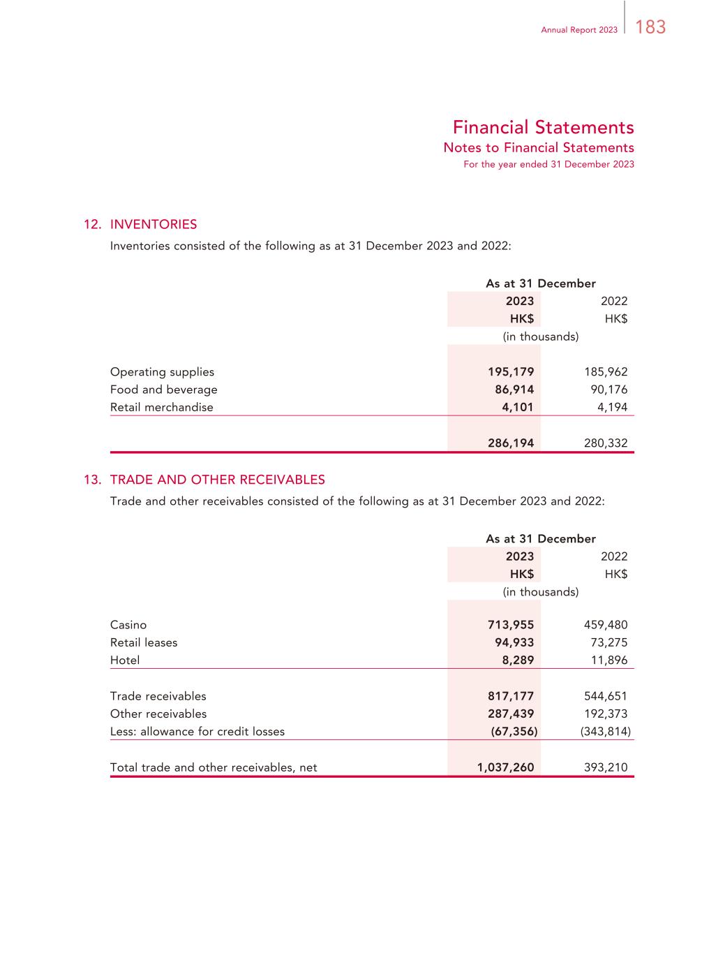 183Annual Report 2023 Financial Statements Notes to Financial Statements For the year ended 31 December 2023 12. INVENTORIES Inventories consisted of the following as at 31 December 2023 and 2022: As at 31 December 2023 2022 HK$ HK$ (in thousands) Operating supplies 195,179 185,962 Food and beverage 86,914 90,176 Retail merchandise 4,101 4,194 286,194 280,332 13. TRADE AND OTHER RECEIVABLES Trade and other receivables consisted of the following as at 31 December 2023 and 2022: As at 31 December 2023 2022 HK$ HK$ (in thousands) Casino 713,955 459,480 Retail leases 94,933 73,275 Hotel 8,289 11,896 Trade receivables 817,177 544,651 Other receivables 287,439 192,373 Less: allowance for credit losses (67,356) (343,814) Total trade and other receivables, net 1,037,260 393,210
