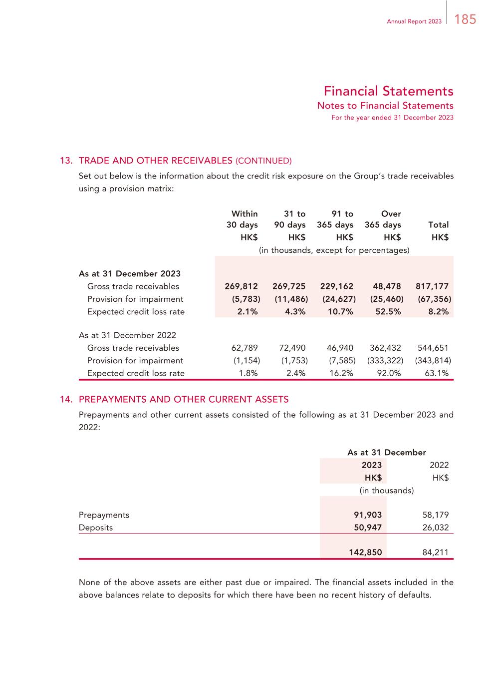 185Annual Report 2023 Financial Statements Notes to Financial Statements For the year ended 31 December 2023 13. TRADE AND OTHER RECEIVABLES (CONTINUED) Set out below is the information about the credit risk exposure on the Group’s trade receivables using a provision matrix: Within 30 days 31 to 90 days 91 to 365 days Over 365 days Total HK$ HK$ HK$ HK$ HK$ (in thousands, except for percentages) As at 31 December 2023 Gross trade receivables 269,812 269,725 229,162 48,478 817,177 Provision for impairment (5,783) (11,486) (24,627) (25,460) (67,356) Expected credit loss rate 2.1% 4.3% 10.7% 52.5% 8.2% As at 31 December 2022 Gross trade receivables 62,789 72,490 46,940 362,432 544,651 Provision for impairment (1,154) (1,753) (7,585) (333,322) (343,814) Expected credit loss rate 1.8% 2.4% 16.2% 92.0% 63.1% 14. PREPAYMENTS AND OTHER CURRENT ASSETS Prepayments and other current assets consisted of the following as at 31 December 2023 and 2022: As at 31 December 2023 2022 HK$ HK$ (in thousands) Prepayments 91,903 58,179 Deposits 50,947 26,032 142,850 84,211 None of the above assets are either past due or impaired. The financial assets included in the above balances relate to deposits for which there have been no recent history of defaults.