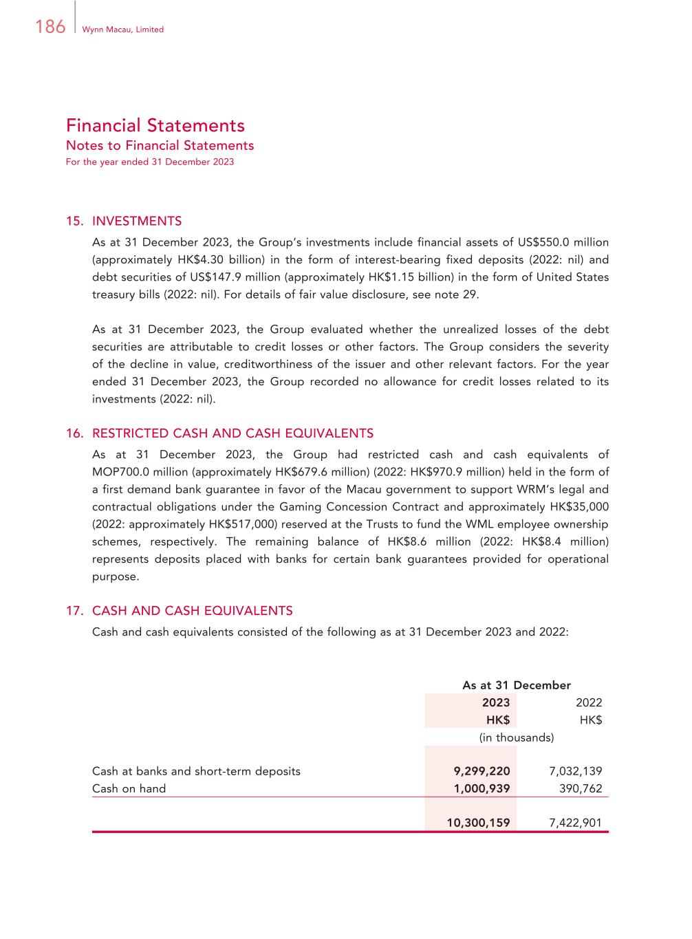 186 Wynn Macau, Limited Financial Statements Notes to Financial Statements For the year ended 31 December 2023 15. INVESTMENTS As at 31 December 2023, the Group’s investments include financial assets of US$550.0 million (approximately HK$4.30 billion) in the form of interest-bearing fixed deposits (2022: nil) and debt securities of US$147.9 million (approximately HK$1.15 billion) in the form of United States treasury bills (2022: nil). For details of fair value disclosure, see note 29. As at 31 December 2023, the Group evaluated whether the unrealized losses of the debt securities are attributable to credit losses or other factors. The Group considers the severity of the decline in value, creditworthiness of the issuer and other relevant factors. For the year ended 31 December 2023, the Group recorded no allowance for credit losses related to its investments (2022: nil). 16. RESTRICTED CASH AND CASH EQUIVALENTS As at 31 December 2023, the Group had restricted cash and cash equivalents of MOP700.0 million (approximately HK$679.6 million) (2022: HK$970.9 million) held in the form of a first demand bank guarantee in favor of the Macau government to support WRM’s legal and contractual obligations under the Gaming Concession Contract and approximately HK$35,000 (2022: approximately HK$517,000) reserved at the Trusts to fund the WML employee ownership schemes, respectively. The remaining balance of HK$8.6 million (2022: HK$8.4 million) represents deposits placed with banks for certain bank guarantees provided for operational purpose. 17. CASH AND CASH EQUIVALENTS Cash and cash equivalents consisted of the following as at 31 December 2023 and 2022: As at 31 December 2023 2022 HK$ HK$ (in thousands) Cash at banks and short-term deposits 9,299,220 7,032,139 Cash on hand 1,000,939 390,762 10,300,159 7,422,901