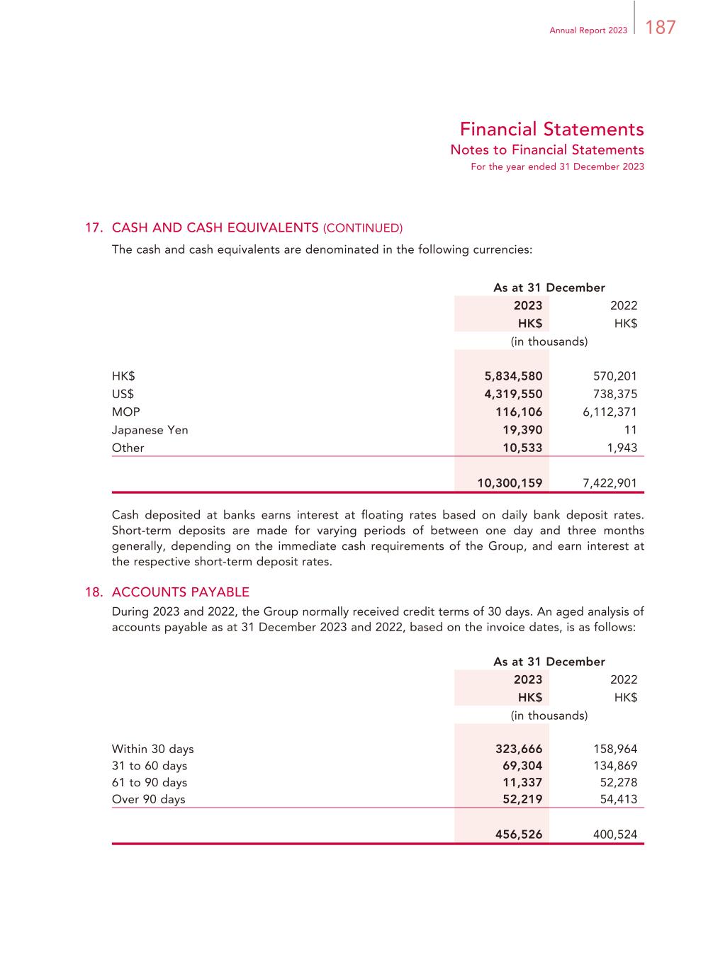 187Annual Report 2023 Financial Statements Notes to Financial Statements For the year ended 31 December 2023 17. CASH AND CASH EQUIVALENTS (CONTINUED) The cash and cash equivalents are denominated in the following currencies: As at 31 December 2023 2022 HK$ HK$ (in thousands) HK$ 5,834,580 570,201 US$ 4,319,550 738,375 MOP 116,106 6,112,371 Japanese Yen 19,390 11 Other 10,533 1,943 10,300,159 7,422,901 Cash deposited at banks earns interest at floating rates based on daily bank deposit rates. Short-term deposits are made for varying periods of between one day and three months generally, depending on the immediate cash requirements of the Group, and earn interest at the respective short-term deposit rates. 18. ACCOUNTS PAYABLE During 2023 and 2022, the Group normally received credit terms of 30 days. An aged analysis of accounts payable as at 31 December 2023 and 2022, based on the invoice dates, is as follows: As at 31 December 2023 2022 HK$ HK$ (in thousands) Within 30 days 323,666 158,964 31 to 60 days 69,304 134,869 61 to 90 days 11,337 52,278 Over 90 days 52,219 54,413 456,526 400,524