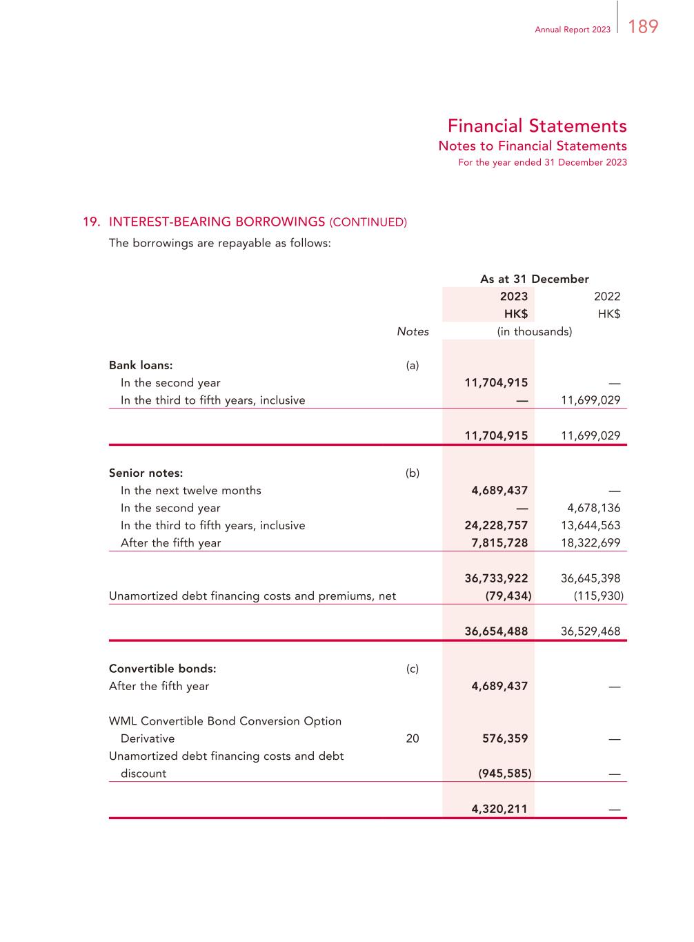 189Annual Report 2023 Financial Statements Notes to Financial Statements For the year ended 31 December 2023 19. INTEREST-BEARING BORROWINGS (CONTINUED) The borrowings are repayable as follows: As at 31 December 2023 2022 HK$ HK$ Notes (in thousands) Bank loans: (a) In the second year 11,704,915 — In the third to fifth years, inclusive — 11,699,029 11,704,915 11,699,029 Senior notes: (b) In the next twelve months 4,689,437 — In the second year — 4,678,136 In the third to fifth years, inclusive 24,228,757 13,644,563 After the fifth year 7,815,728 18,322,699 36,733,922 36,645,398 Unamortized debt financing costs and premiums, net (79,434) (115,930) 36,654,488 36,529,468 Convertible bonds: (c) After the fifth year 4,689,437 — WML Convertible Bond Conversion Option Derivative 20 576,359 — Unamortized debt financing costs and debt discount (945,585) — 4,320,211 —