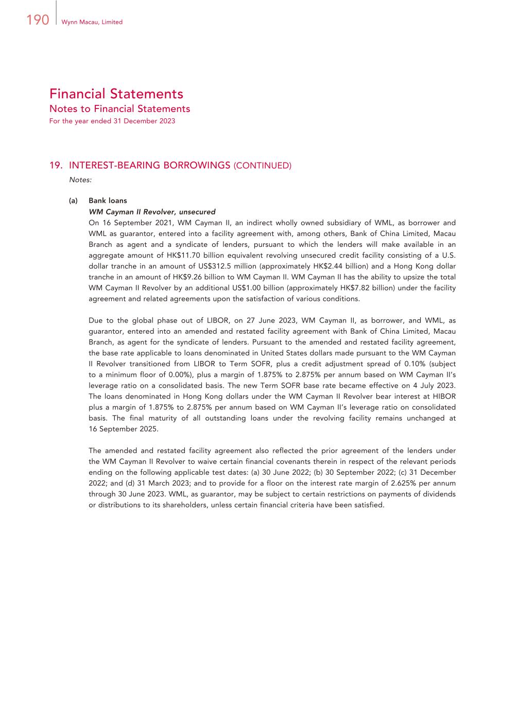 190 Wynn Macau, Limited Financial Statements Notes to Financial Statements For the year ended 31 December 2023 19. INTEREST-BEARING BORROWINGS (CONTINUED) Notes: (a) Bank loans WM Cayman II Revolver, unsecured On 16 September 2021, WM Cayman II, an indirect wholly owned subsidiary of WML, as borrower and WML as guarantor, entered into a facility agreement with, among others, Bank of China Limited, Macau Branch as agent and a syndicate of lenders, pursuant to which the lenders will make available in an aggregate amount of HK$11.70 billion equivalent revolving unsecured credit facility consisting of a U.S. dollar tranche in an amount of US$312.5 million (approximately HK$2.44 billion) and a Hong Kong dollar tranche in an amount of HK$9.26 billion to WM Cayman II. WM Cayman II has the ability to upsize the total WM Cayman II Revolver by an additional US$1.00 billion (approximately HK$7.82 billion) under the facility agreement and related agreements upon the satisfaction of various conditions. Due to the global phase out of LIBOR, on 27 June 2023, WM Cayman II, as borrower, and WML, as guarantor, entered into an amended and restated facility agreement with Bank of China Limited, Macau Branch, as agent for the syndicate of lenders. Pursuant to the amended and restated facility agreement, the base rate applicable to loans denominated in United States dollars made pursuant to the WM Cayman II Revolver transitioned from LIBOR to Term SOFR, plus a credit adjustment spread of 0.10% (subject to a minimum floor of 0.00%), plus a margin of 1.875% to 2.875% per annum based on WM Cayman II’s leverage ratio on a consolidated basis. The new Term SOFR base rate became effective on 4 July 2023. The loans denominated in Hong Kong dollars under the WM Cayman II Revolver bear interest at HIBOR plus a margin of 1.875% to 2.875% per annum based on WM Cayman II’s leverage ratio on consolidated basis. The final maturity of all outstanding loans under the revolving facility remains unchanged at 16 September 2025. The amended and restated facility agreement also reflected the prior agreement of the lenders under the WM Cayman II Revolver to waive certain financial covenants therein in respect of the relevant periods ending on the following applicable test dates: (a) 30 June 2022; (b) 30 September 2022; (c) 31 December 2022; and (d) 31 March 2023; and to provide for a floor on the interest rate margin of 2.625% per annum through 30 June 2023. WML, as guarantor, may be subject to certain restrictions on payments of dividends or distributions to its shareholders, unless certain financial criteria have been satisfied.