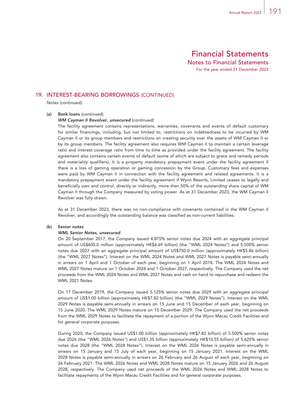 191Annual Report 2023 Financial Statements Notes to Financial Statements For the year ended 31 December 2023 19. INTEREST-BEARING BORROWINGS (CONTINUED) Notes (continued): (a) Bank loans (continued) WM Cayman II Revolver, unsecured (continued) The facility agreement contains representations, warranties, covenants and events of default customary for similar financings, including, but not limited to, restrictions on indebtedness to be incurred by WM Cayman II or its group members and restrictions on creating security over the assets of WM Cayman II or by its group members. The facility agreement also requires WM Cayman II to maintain a certain leverage ratio and interest coverage ratio from time to time as provided under the facility agreement. The facility agreement also contains certain events of default (some of which are subject to grace and remedy periods and materiality qualifiers). It is a property mandatory prepayment event under the facility agreement if there is a loss of gaming operation or gaming concession by the Group. Customary fees and expenses were paid by WM Cayman II in connection with the facility agreement and related agreements. It is a mandatory prepayment event under the facility agreement if Wynn Resorts, Limited ceases to legally and beneficially own and control, directly or indirectly, more than 50% of the outstanding share capital of WM Cayman II through the Company measured by voting power. As at 31 December 2023, the WM Cayman II Revolver was fully drawn. As at 31 December 2023, there was no non-compliance with covenants contained in the WM Cayman II Revolver, and accordingly the outstanding balance was classified as non-current liabilities. (b) Senior notes WML Senior Notes, unsecured On 20 September 2017, the Company issued 4.875% senior notes due 2024 with an aggregate principal amount of US$600.0 million (approximately HK$4.69 billion) (the “WML 2024 Notes”) and 5.500% senior notes due 2027 with an aggregate principal amount of US$750.0 million (approximately HK$5.86 billion) (the “WML 2027 Notes”). Interest on the WML 2024 Notes and WML 2027 Notes is payable semi-annually in arrears on 1 April and 1 October of each year, beginning on 1 April 2018. The WML 2024 Notes and WML 2027 Notes mature on 1 October 2024 and 1 October 2027, respectively. The Company used the net proceeds from the WML 2024 Notes and WML 2027 Notes and cash on hand to repurchase and redeem the WML 2021 Notes. On 17 December 2019, the Company issued 5.125% senior notes due 2029 with an aggregate principal amount of US$1.00 billion (approximately HK$7.82 billion) (the “WML 2029 Notes”). Interest on the WML 2029 Notes is payable semi-annually in arrears on 15 June and 15 December of each year, beginning on 15 June 2020. The WML 2029 Notes mature on 15 December 2029. The Company used the net proceeds from the WML 2029 Notes to facilitate the repayment of a portion of the Wynn Macau Credit Facilities and for general corporate purposes. During 2020, the Company issued US$1.00 billion (approximately HK$7.82 billion) of 5.500% senior notes due 2026 (the “WML 2026 Notes”) and US$1.35 billion (approximately HK$10.55 billion) of 5.625% senior notes due 2028 (the “WML 2028 Notes”). Interest on the WML 2026 Notes is payable semi-annually in arrears on 15 January and 15 July of each year, beginning on 15 January 2021. Interest on the WML 2028 Notes is payable semi-annually in arrears on 26 February and 26 August of each year, beginning on 26 February 2021. The WML 2026 Notes and WML 2028 Notes mature on 15 January 2026 and 26 August 2028, respectively. The Company used net proceeds of the WML 2026 Notes and WML 2028 Notes to facilitate repayments of the Wynn Macau Credit Facilities and for general corporate purposes.