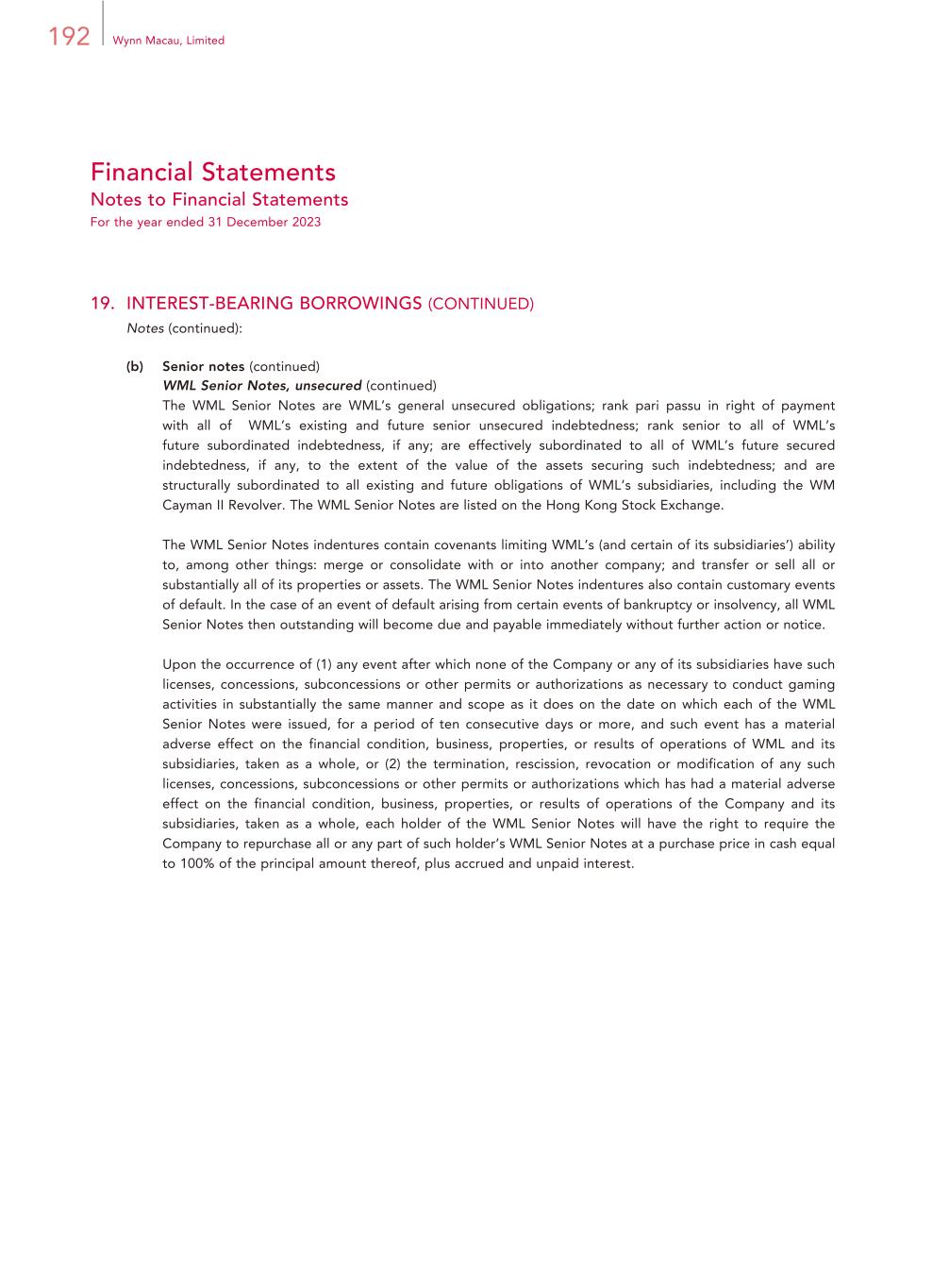 192 Wynn Macau, Limited Financial Statements Notes to Financial Statements For the year ended 31 December 2023 19. INTEREST-BEARING BORROWINGS (CONTINUED) Notes (continued): (b) Senior notes (continued) WML Senior Notes, unsecured (continued) The WML Senior Notes are WML’s general unsecured obligations; rank pari passu in right of payment with all of WML’s existing and future senior unsecured indebtedness; rank senior to all of WML’s future subordinated indebtedness, if any; are effectively subordinated to all of WML’s future secured indebtedness, if any, to the extent of the value of the assets securing such indebtedness; and are structurally subordinated to all existing and future obligations of WML’s subsidiaries, including the WM Cayman II Revolver. The WML Senior Notes are listed on the Hong Kong Stock Exchange. The WML Senior Notes indentures contain covenants limiting WML’s (and certain of its subsidiaries’) ability to, among other things: merge or consolidate with or into another company; and transfer or sell all or substantially all of its properties or assets. The WML Senior Notes indentures also contain customary events of default. In the case of an event of default arising from certain events of bankruptcy or insolvency, all WML Senior Notes then outstanding will become due and payable immediately without further action or notice. Upon the occurrence of (1) any event after which none of the Company or any of its subsidiaries have such licenses, concessions, subconcessions or other permits or authorizations as necessary to conduct gaming activities in substantially the same manner and scope as it does on the date on which each of the WML Senior Notes were issued, for a period of ten consecutive days or more, and such event has a material adverse effect on the financial condition, business, properties, or results of operations of WML and its subsidiaries, taken as a whole, or (2) the termination, rescission, revocation or modification of any such licenses, concessions, subconcessions or other permits or authorizations which has had a material adverse effect on the financial condition, business, properties, or results of operations of the Company and its subsidiaries, taken as a whole, each holder of the WML Senior Notes will have the right to require the Company to repurchase all or any part of such holder’s WML Senior Notes at a purchase price in cash equal to 100% of the principal amount thereof, plus accrued and unpaid interest.