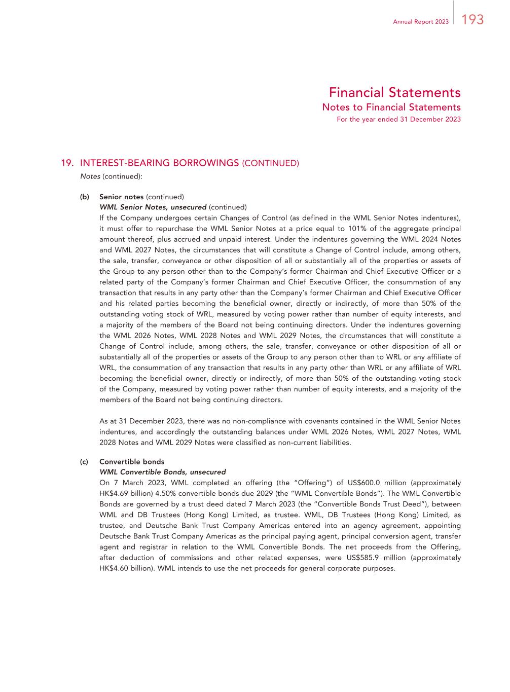 193Annual Report 2023 Financial Statements Notes to Financial Statements For the year ended 31 December 2023 19. INTEREST-BEARING BORROWINGS (CONTINUED) Notes (continued): (b) Senior notes (continued) WML Senior Notes, unsecured (continued) If the Company undergoes certain Changes of Control (as defined in the WML Senior Notes indentures), it must offer to repurchase the WML Senior Notes at a price equal to 101% of the aggregate principal amount thereof, plus accrued and unpaid interest. Under the indentures governing the WML 2024 Notes and WML 2027 Notes, the circumstances that will constitute a Change of Control include, among others, the sale, transfer, conveyance or other disposition of all or substantially all of the properties or assets of the Group to any person other than to the Company’s former Chairman and Chief Executive Officer or a related party of the Company’s former Chairman and Chief Executive Officer, the consummation of any transaction that results in any party other than the Company’s former Chairman and Chief Executive Officer and his related parties becoming the beneficial owner, directly or indirectly, of more than 50% of the outstanding voting stock of WRL, measured by voting power rather than number of equity interests, and a majority of the members of the Board not being continuing directors. Under the indentures governing the WML 2026 Notes, WML 2028 Notes and WML 2029 Notes, the circumstances that will constitute a Change of Control include, among others, the sale, transfer, conveyance or other disposition of all or substantially all of the properties or assets of the Group to any person other than to WRL or any affiliate of WRL, the consummation of any transaction that results in any party other than WRL or any affiliate of WRL becoming the beneficial owner, directly or indirectly, of more than 50% of the outstanding voting stock of the Company, measured by voting power rather than number of equity interests, and a majority of the members of the Board not being continuing directors. As at 31 December 2023, there was no non-compliance with covenants contained in the WML Senior Notes indentures, and accordingly the outstanding balances under WML 2026 Notes, WML 2027 Notes, WML 2028 Notes and WML 2029 Notes were classified as non-current liabilities. (c) Convertible bonds WML Convertible Bonds, unsecured On 7 March 2023, WML completed an offering (the “Offering”) of US$600.0 million (approximately HK$4.69 billion) 4.50% convertible bonds due 2029 (the “WML Convertible Bonds”). The WML Convertible Bonds are governed by a trust deed dated 7 March 2023 (the “Convertible Bonds Trust Deed”), between WML and DB Trustees (Hong Kong) Limited, as trustee. WML, DB Trustees (Hong Kong) Limited, as trustee, and Deutsche Bank Trust Company Americas entered into an agency agreement, appointing Deutsche Bank Trust Company Americas as the principal paying agent, principal conversion agent, transfer agent and registrar in relation to the WML Convertible Bonds. The net proceeds from the Offering, after deduction of commissions and other related expenses, were US$585.9 million (approximately HK$4.60 billion). WML intends to use the net proceeds for general corporate purposes.