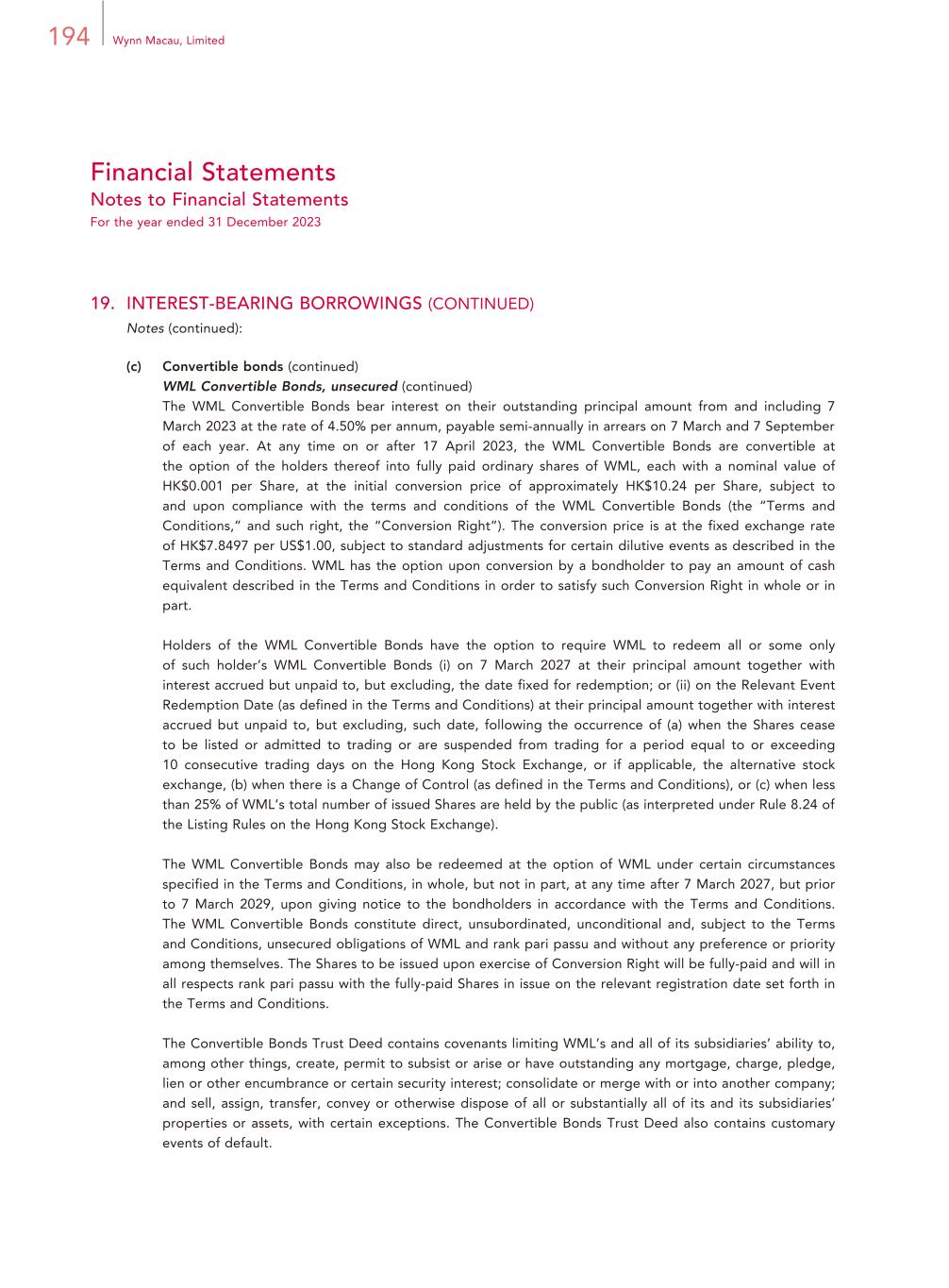 194 Wynn Macau, Limited Financial Statements Notes to Financial Statements For the year ended 31 December 2023 19. INTEREST-BEARING BORROWINGS (CONTINUED) Notes (continued): (c) Convertible bonds (continued) WML Convertible Bonds, unsecured (continued) The WML Convertible Bonds bear interest on their outstanding principal amount from and including 7 March 2023 at the rate of 4.50% per annum, payable semi-annually in arrears on 7 March and 7 September of each year. At any time on or after 17 April 2023, the WML Convertible Bonds are convertible at the option of the holders thereof into fully paid ordinary shares of WML, each with a nominal value of HK$0.001 per Share, at the initial conversion price of approximately HK$10.24 per Share, subject to and upon compliance with the terms and conditions of the WML Convertible Bonds (the “Terms and Conditions,” and such right, the “Conversion Right”). The conversion price is at the fixed exchange rate of HK$7.8497 per US$1.00, subject to standard adjustments for certain dilutive events as described in the Terms and Conditions. WML has the option upon conversion by a bondholder to pay an amount of cash equivalent described in the Terms and Conditions in order to satisfy such Conversion Right in whole or in part. Holders of the WML Convertible Bonds have the option to require WML to redeem all or some only of such holder’s WML Convertible Bonds (i) on 7 March 2027 at their principal amount together with interest accrued but unpaid to, but excluding, the date fixed for redemption; or (ii) on the Relevant Event Redemption Date (as defined in the Terms and Conditions) at their principal amount together with interest accrued but unpaid to, but excluding, such date, following the occurrence of (a) when the Shares cease to be listed or admitted to trading or are suspended from trading for a period equal to or exceeding 10 consecutive trading days on the Hong Kong Stock Exchange, or if applicable, the alternative stock exchange, (b) when there is a Change of Control (as defined in the Terms and Conditions), or (c) when less than 25% of WML’s total number of issued Shares are held by the public (as interpreted under Rule 8.24 of the Listing Rules on the Hong Kong Stock Exchange). The WML Convertible Bonds may also be redeemed at the option of WML under certain circumstances specified in the Terms and Conditions, in whole, but not in part, at any time after 7 March 2027, but prior to 7 March 2029, upon giving notice to the bondholders in accordance with the Terms and Conditions. The WML Convertible Bonds constitute direct, unsubordinated, unconditional and, subject to the Terms and Conditions, unsecured obligations of WML and rank pari passu and without any preference or priority among themselves. The Shares to be issued upon exercise of Conversion Right will be fully-paid and will in all respects rank pari passu with the fully-paid Shares in issue on the relevant registration date set forth in the Terms and Conditions. The Convertible Bonds Trust Deed contains covenants limiting WML’s and all of its subsidiaries’ ability to, among other things, create, permit to subsist or arise or have outstanding any mortgage, charge, pledge, lien or other encumbrance or certain security interest; consolidate or merge with or into another company; and sell, assign, transfer, convey or otherwise dispose of all or substantially all of its and its subsidiaries’ properties or assets, with certain exceptions. The Convertible Bonds Trust Deed also contains customary events of default.